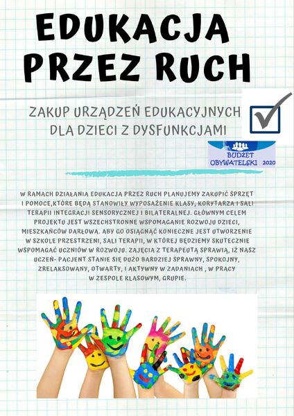 Gorąco zachęcamy wszystkich Mieszkańców Darłowa do głosowania na nasz projekt społeczny w ramach Budżetu Obywatelskiego Miasta Darłowo 2020. Głosować można w Urzędzie Miasta w Darłowie, Terminalu Odpraw Pasażerskich w Darłówku oraz na stronie https://bo.darlowo.pl/. Nasz projekt to: Edukacja przez ruch. Zakup urządzeń edukacyjnych dla dzieci z dysfunkcjami.