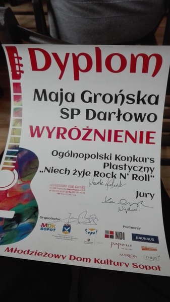 W dniu 25 listopada br. odbył się finał VII Ogólnopolskiego Konkursu Plastycznego „NIECH ŻYJE ROCK 'N' ROLL”, którego organizatorem był Młodzieżowy Dom Kultury w Sopocie. Na konkurs wpłynęło 380 prac plastycznych i 28 rzeźb ze szkół i placówek oświatowych z całej Polski, wśród których znalazły się również prace naszych uczniów.