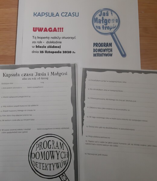 Uczniowie w czasie zajęć mieli okazję wypełnić swoje ”Kapsuły czasu”. „Kapsuła czasu” – pozwala ludziom podróżować w czasie i czegoś się przy tym nauczyć. Każdy uczeń otrzymał swoją „kapsułę czasu”. Zadanie polegało na jej wypełnieniu i włożeniu do koperty, którą zakleili. Do „Kapsuły czasu” uczniowie zajrzą dopiero za rok, nikt nie będzie mógł zobaczyć ich zawartości, dopóki sami nie otworzą ich w przyszłym roku. Po roku czasu zobaczą, jakie zmiany zaszły w ich życiu.