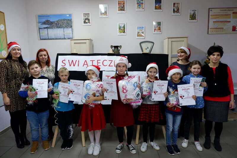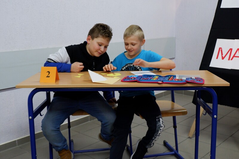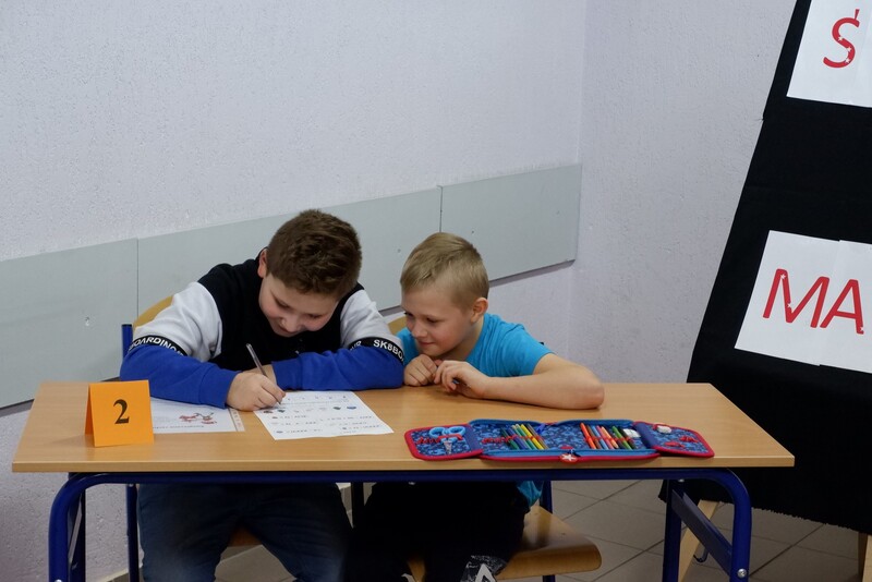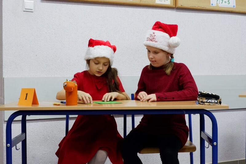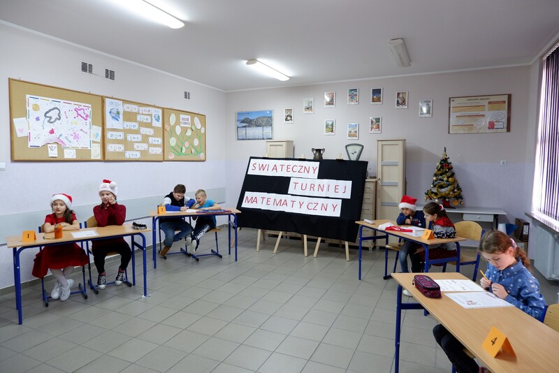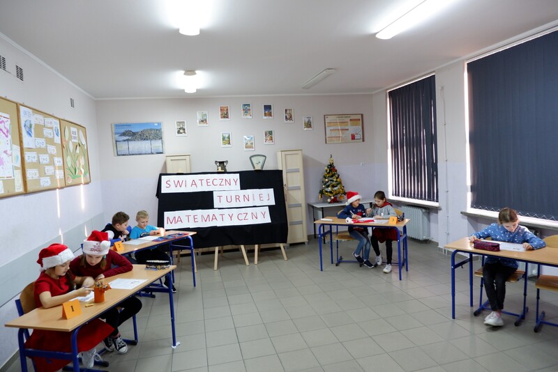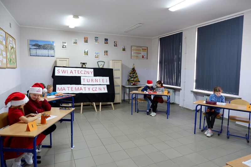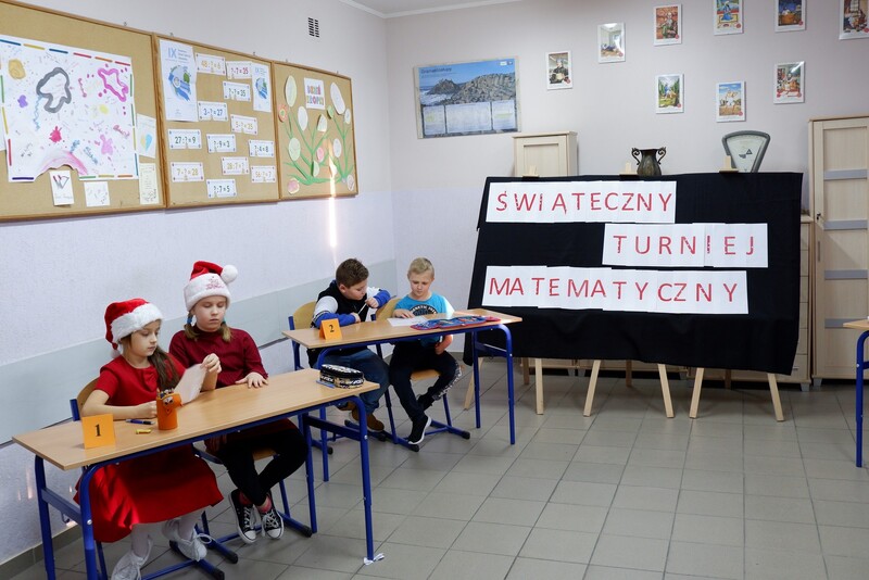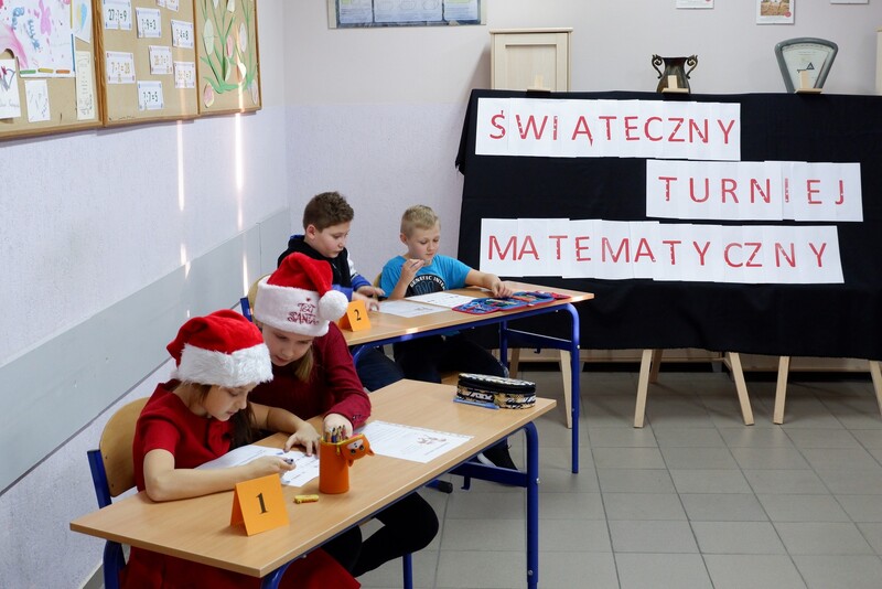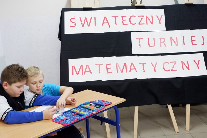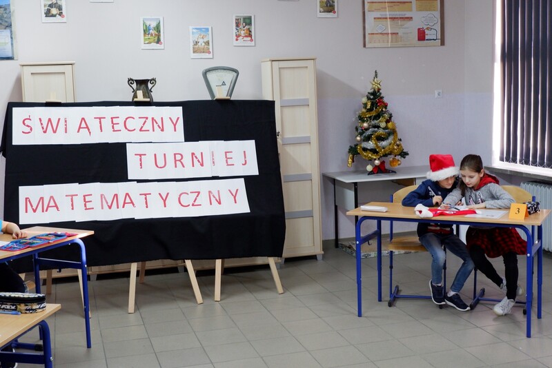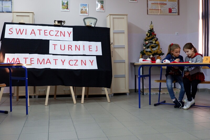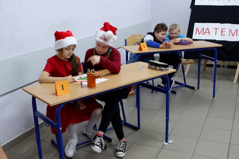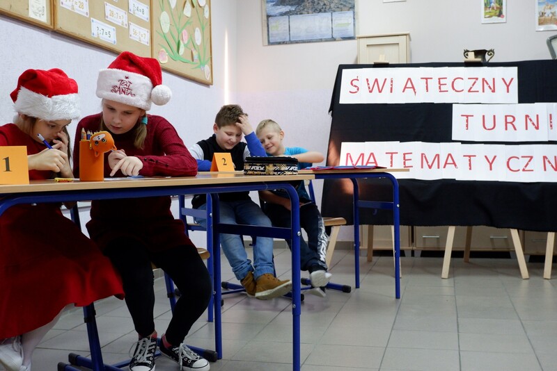 Dnia 17 grudnia w naszej szkole zrobiło się świątecznie. Przekonali się o tym uczniowie klas czwartych, którzy wzięli udział w „Świątecznym Turnieju Matematycznym”. Dwuosobowe drużyny zmierzyły się ze sobą w pięciu konkurencjach wymagających od uczestników oprócz wiedzy matematycznej, także pomysłowości oraz szybkości podejmowania wspólnej decyzji. Drużyny miały do rozwiązania zadania tj. świąteczne rachunki, tangram, krzyżówkę matematyczną, domino „Gwiazda” oraz matematyczną choinkę. Nad przebiegiem konkursu czuwało jury w składzie: wicedyrektor Katarzyna Łusiewicz oraz wicedyrektor Justyna Tomczyk.