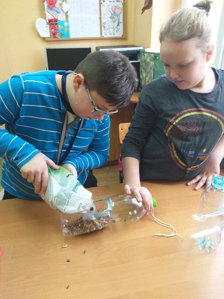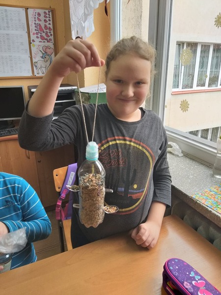 Uczniowie grupy do 5 osób pracowicie zaczęli czas zaraz po feriach. Najpierw nauczyli się podstawowych informacji o ptakach i o tym, czym się żywią. Następnie udali się do sklepu w celu zakupu karmy i przysmaków dla swoich maleńkich przyjaciół. Tydzień zakończyli zrobieniem pięknych karmników, które z pomocą Pana Jacka i Pana Andrzeja zostały umieszczone na terenie szkoły. Pamiętajmy o zwierzętach zimą!