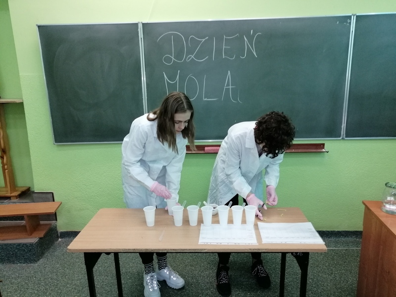 23 października obchodziliśmy Dzień Mola, nieoficjalne święto chemików. Data i godziny (6:02 AM i 6:02 PM) odnoszą się do stałej Avogadra, której wartość w przybliżeniu wynosi 6,022x1023 i jest związana z definicją jednostki liczności materii (mol). Z tej też okazji uczniowie klas ósmych poszerzyli swoją wiedzę chemiczną z tak trudnego zakresu. O tym, że nauka chemii to nie tylko skomplikowane obliczenia, pojęcia czy reakcje, przekonali się, wykonując ciekawe doświadczenia. Były to badania odczynu roztworów, określanie pH produktów spożywczych oraz środków czystości, jak też „doświadczenia z apteki”, w których porównali wybrane właściwości witaminy C i B3, zbadali trwałość produktów spożywczych wobec witaminy C oraz określili odczyn powstałych gazów w wyniku działania wodorotlenku sodu na roztwór witaminy B3. Zajęcia cieszyły się dużym zainteresowaniem oraz angażowały wszystkich uczniów do aktywnego uczestnictwa.