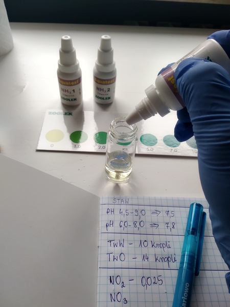Ogólne wyniki próbek wody z morza, rzeki i stawu były bardzo zbliżone. Do oznaczenia twardości ogólnej wody użyto stopni niemieckich, gdzie 1 stopień odpowiada zawartości 10 mg tlenku wapnia w 1 litrze wody. Twardość ogólna to zawartość całkowita soli wapnia i magnezu. W stawie była to woda średnio twarda, a w morzu i rzece woda miękka. Uzyskaliśmy niewielkie stężenie azotynów NO2 w stawie, natomiast w morzu i rzece ich nie wykryto. Wynik równy zero był również dla azotanów NO3 w morzu, rzece i stawie. Stężenie amoniaku NH3 dla stawu to 0,02 mg/l, w morzu i rzece amoniaku brak. Wartość stężenia fosforanów dla wody w morzu, rzece i stawie wyniosła 0,25 mg/l. Wszystkie otrzymane wyniki nie budzą niepokoju, są w normie.