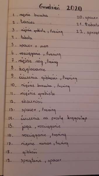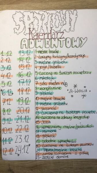 I już dobiegła końca sportowa akcja zaproponowana na lekcjach wychowania fizycznego w okresie Adwentu. W tym roku zamiast czekoladowego kalendarza adwentowego wybraliśmy kalendarz sportowy. Zamiast słodkich niespodzianek, na każdy dzień przygotowany był zestaw ćwiczeń do wykonania. Kalendarz obowiązywał od pierwszego grudnia, codziennie obfitował w inne zadania. Zawsze pamiętaliśmy o rozgrzewce i przestrzegaliśmy zasad bezpieczeństwa. Dbaliśmy o zdrowie i smukłą sylwetkę ćwicząc jogę, zumbę, tabatę czy wzmacniając mięśnie ramion, nóg, brzucha, pośladków i grzbietu. Nie obyło się bez ćwiczeń na zdrowy kręgosłup czy spacer na świeżym powietrzu. Liczyła się samodyscyplina i samozaparcie, zwłaszcza w dniach wolnych od lekcji wychowania fizycznego. Wśród uczniów znaleźli się tacy, którzy swoim zaangażowaniem podzielili się z nauczycielem. Wytrwali codziennie ćwicząc. Sprostać postawionym zadaniom. Satysfakcja pełna. Gratulacje dla nich. Przed nami Święta Bożego Narodzenia, zatem dla wszystkich zdrowych i wesołych Świąt.