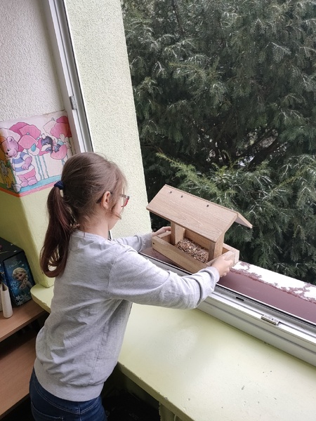 Przygotowany z wielkim zaangażowaniem karmnik już stoi na parapecie w naszej klasie i czeka na „gości”.