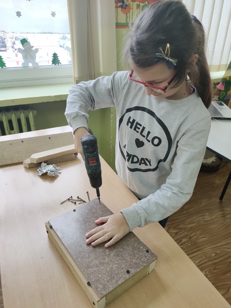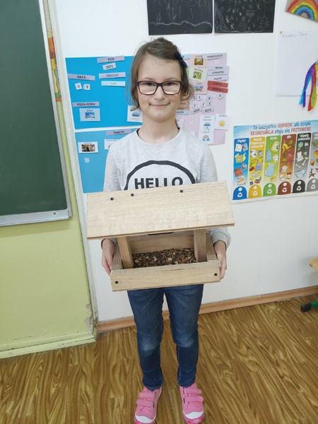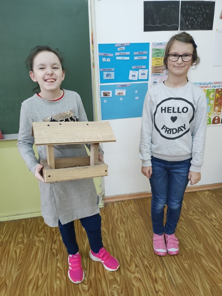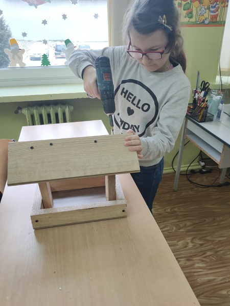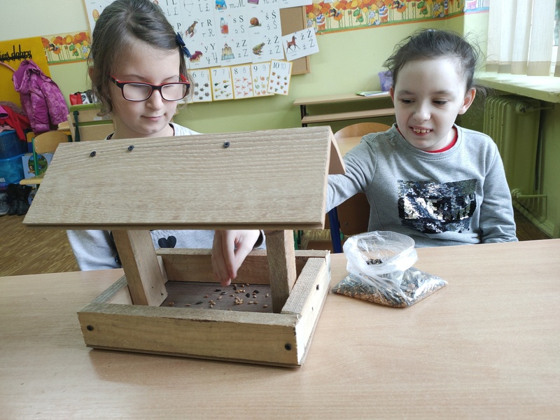 Aby pomóc ptakom przetrwać zimę, uczennice klasy drugiej na zajęciach technicznych zrobiły piękny karmnik. Jego wykonanie sprawiło dziewczynkom wiele radości i frajdy, a przy okazji utrwaliły wiadomości na temat ptaków, które pozostają na zimę oraz odpowiedniej karmy jaką należy umieścić w karmniku, dzięki której zwabimy do ptasiej stołówki wiele kolorowych gatunków ptaków na obfity poczęstunek zimą.