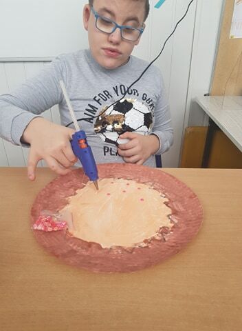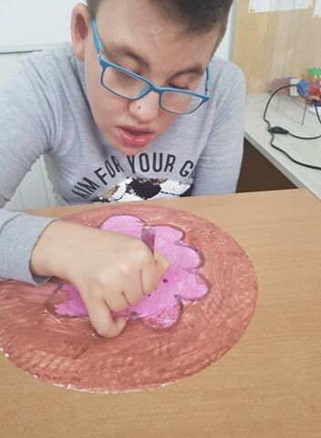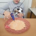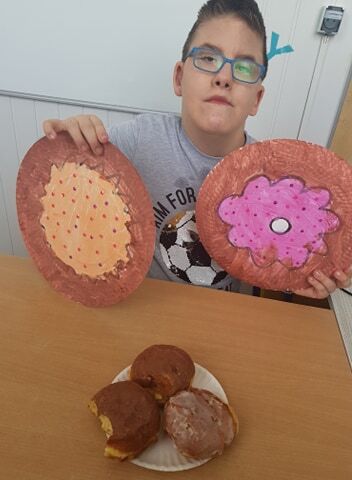 uczniowie o specjalnych potrzebach edukacyjnych Wiktor z 3b i Mateusz z 5b musieli nieźle napracować się przed zjedzeniem słodkiego pączka. Wykonali szereg zadań: opisywali, kolorowali, ozdabiali, smakowali ... by w końcu zjeść pysznego pączka.
