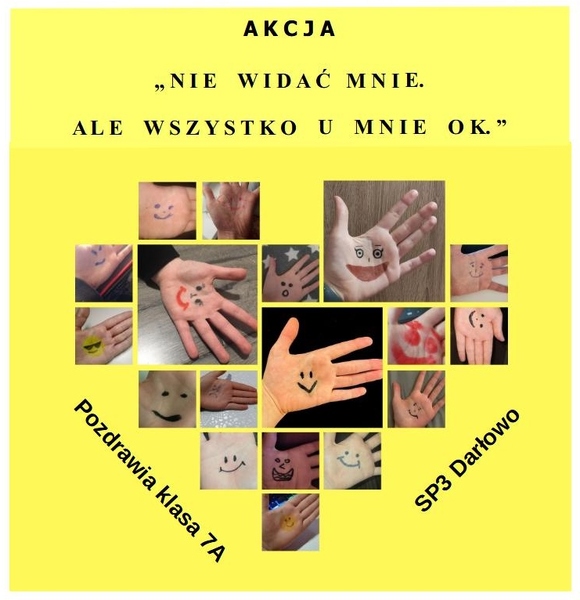 Klasa 7 A dołączyła do ogólnopolskiej akcji „Nie widać mnie, ale wszystko u mnie ok”. Uczniowie narysowali na swojej dłoni emocje, aby pokazać, co u nich słychać i jak się czują. Był to kolejny krok do wytworzenia relacji i zachęty uczniów do rozmowy na temat naszych codziennych emocji, szczególnie tych, które towarzyszą nam każdego dnia nauki zdalnej.
