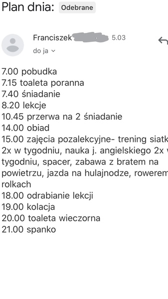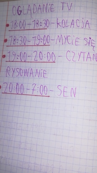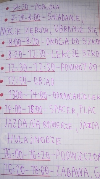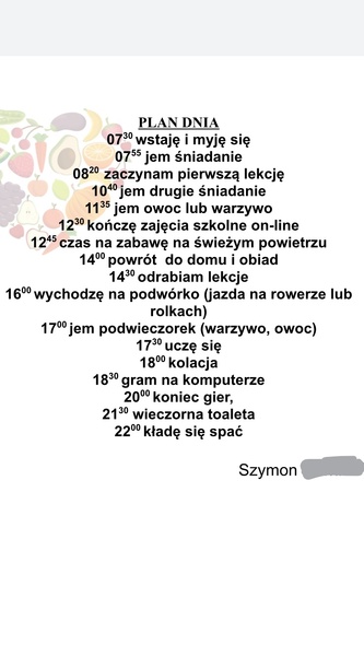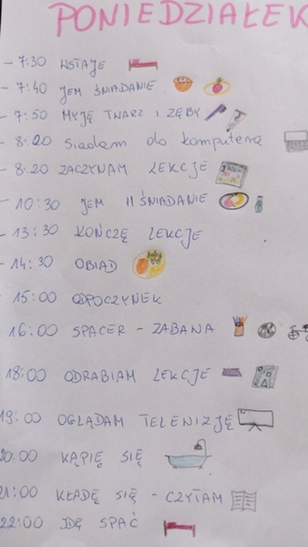 Sposób życia, nasze codzienne czynności mają ogromny wpływ na nasze aktualne samopoczucie a przede wszystkim zdrowie w przyszłości. Jeżeli zadbamy o kilka naturalnych i codziennych nawyków, z większym prawdopodobieństwem przyczynimy się do lepszego zdrowia naszych uczniów w przyszłości. Prowadzone zajęcia lekcyjne miały na celu: znalezienie uzasadnienia, dlaczego umiejętność planowania przydaje się w codziennym życiu; jak wyznaczać najważniejsze zadania do wykonania w ciągu dnia i tygodnia; określać ilość czasu potrzebnego do wykonania poszczególnych czynności oraz samodzielne planowanie swoich zajęć w ciągu dnia. Uczniowie dowiedzieli się, że mając dobry plan, wszystkie zadania wykonają szybciej i sprawniej. Przygotowując swój plan dnia, uwzględniali zarówno czas na odrabianie lekcji i naukę, czas na aktywność fizyczną, posiłki i ich przygotowanie, domowe obowiązki (sprzątanie, opieka nad domowymi zwierzętami), higienę (tak ważną właśnie teraz!), spędzanie czasu wolnego indywidualnie i wspólnie, zabawę, jak i odpoczynek, drzemkę, sen. Zwłaszcza regeneracji podczas snu poświęciliśmy wiele uwagi i wytwarzaniu w nocy hormonu - melatoniny, hamującej rozrost tkanek rakowych. Ustaliliśmy, że będziemy się kłaść spać na tyle wcześnie, by mózg mógł wypocząć.