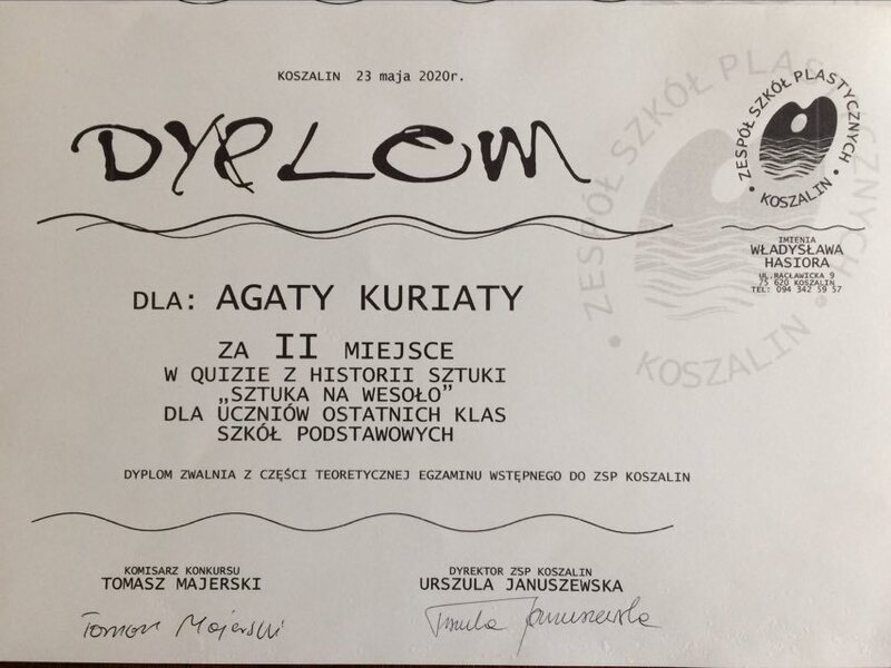 Zadaniem uczestników było wykonanie trzech prac: z dziedziny rysunku, malarstwa i rzeźby. Świetnie poradziła sobie z tym zadaniem uczennica SP3 Darłowo - Agata Kuriata, otrzymując wysoko oceniane wyróżnienie. Agata zajęła również 2 miejsce w ubiegłorocznym quizie wiedzy z historii sztuki (online) i dzięki tym osiągnięciom została zwolniona z egzaminu praktycznego oraz teoretycznego do tej szkoły i ma otwartą drogę, aby podjąć naukę w koszalińskim plastyku.