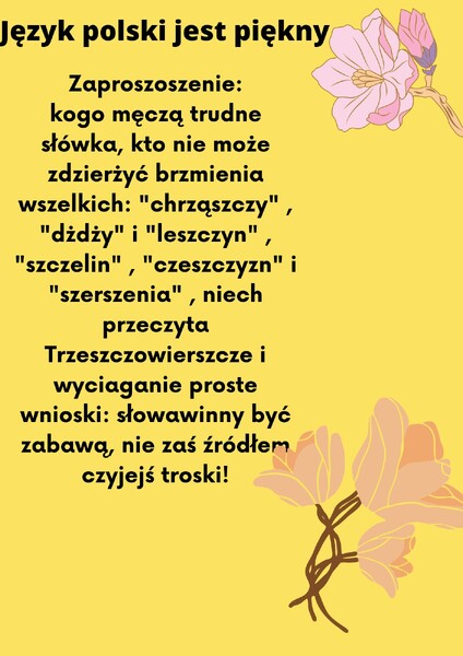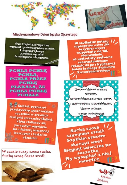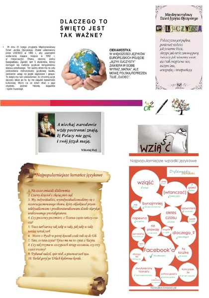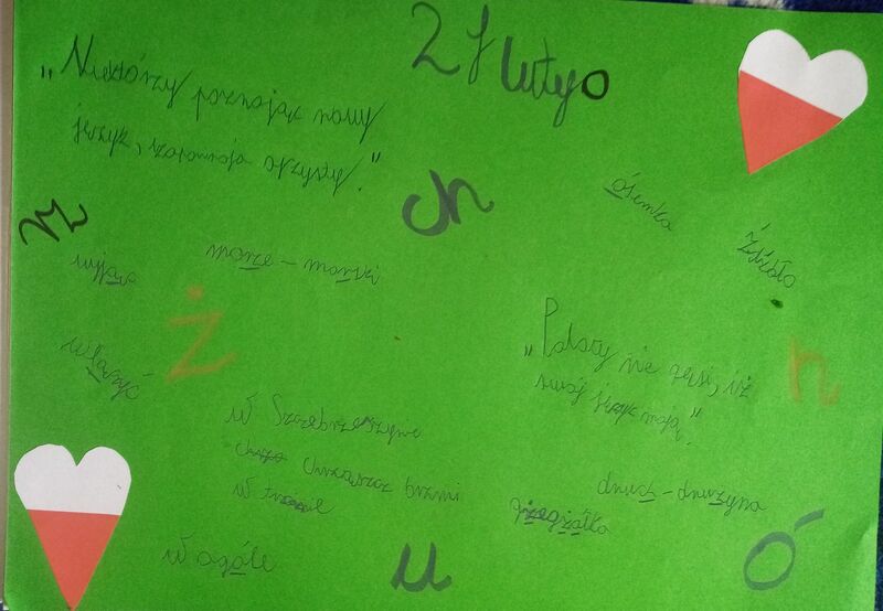 Język polski, jak każdy, wymaga ochrony, dlatego w naszej szkole odbył się konkurs mający na celu troskę o jego rozwój, popularyzację, upowszechnianie świadomości językowej i odpowiedzialności za polszczyznę. Z tej okazji uczniowie przygotowali różnorodne prace propagujące język polski oraz przypomnieli o urokliwych wyrazach w języku ojczystym.