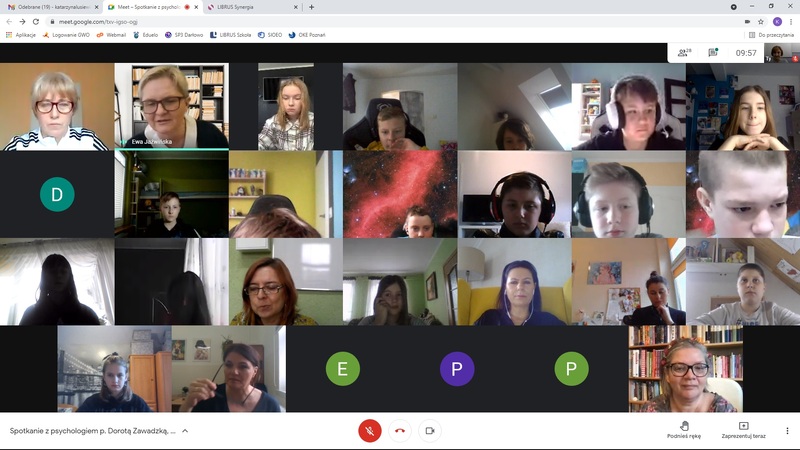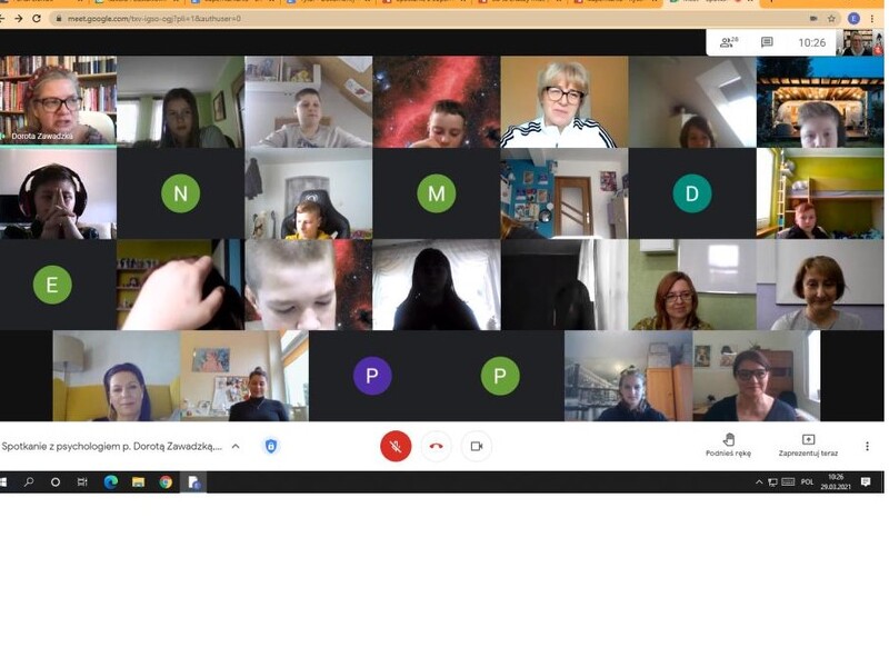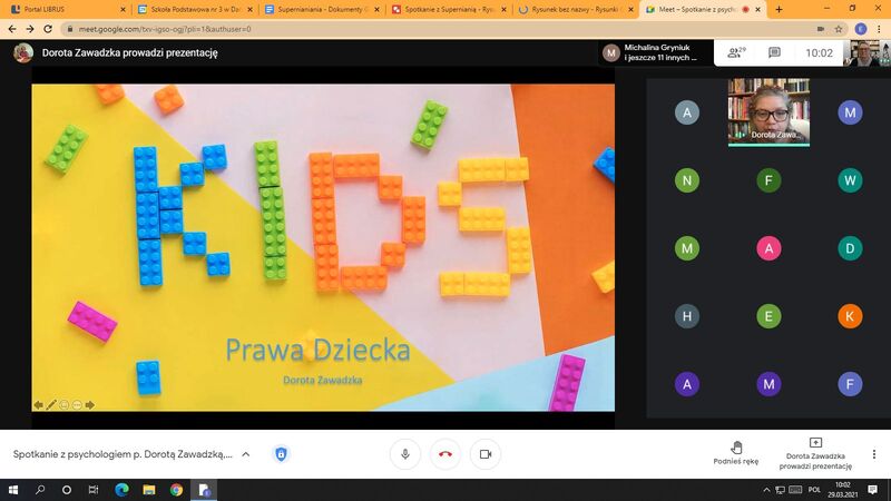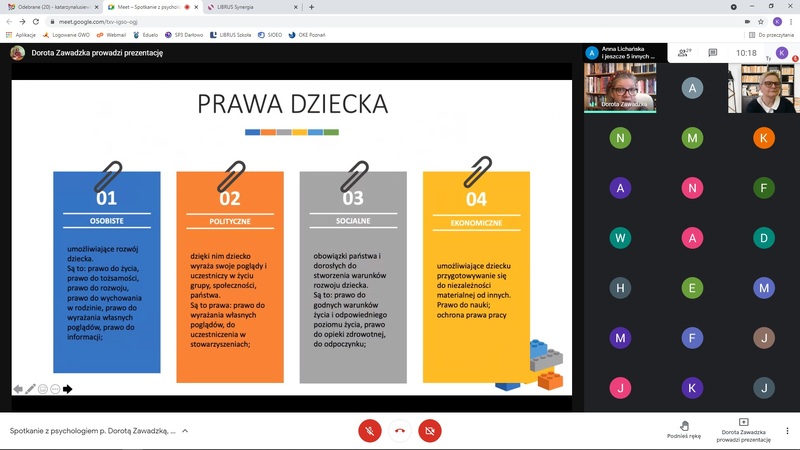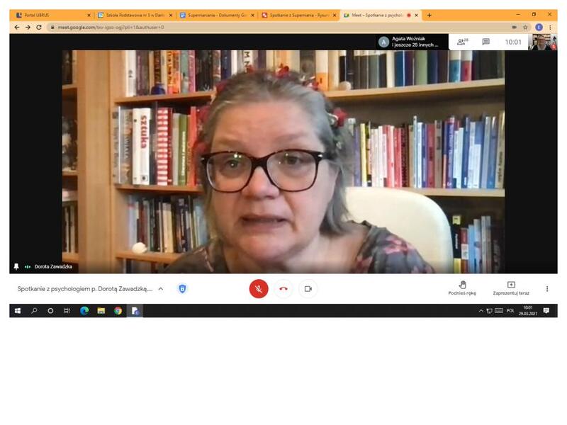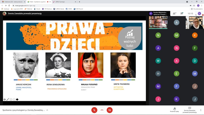 Dorota Zawadzka jest psychologiem rozwojowym, doradcą rodzinnym, trenerem umiejętności społecznych, specjalistką w sprawach rozwoju człowieka, wychowania oraz mediów dla dzieci i młodzieży. 29 marca odbyła się zdalnie lekcja wychowawcza w klasie szóstej, na której poruszono tematykę dotyczącą praw człowieka i praw dziecka. Uczniowie zostali wprowadzeni w temat dzięki krótkiej prezentacji, poznali klika faktów historycznych, postaci walczących o uznanie praw dzieci. W rozmowie poruszono także temat obowiązków dzieci, odpowiedzialności za swoje czyny, wartości uczenia się dla siebie.