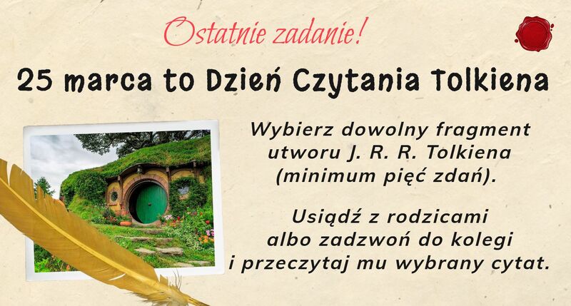 Dnia 25.03.2021 roku w naszej szkole obchodzony był dzień czytania Tolkiena. Celem tegoż święta było spopularyzowanie książek autora i nakłonienie młodych ludzi do czytania.