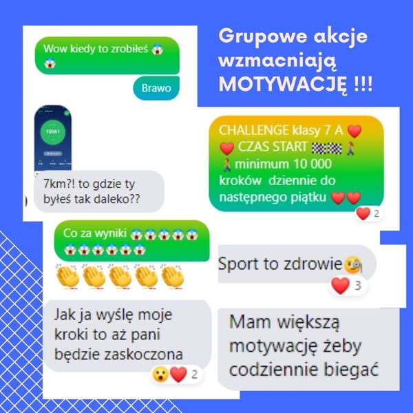 Kwiecień to miesiąc promujący zdrowie, zatem idealny moment na popularyzowanie ruchu na świeżym powietrzu. W ramach obchodów Światowego Dnia Zdrowia uczniowie podczas lekcji wychowawczej zapoznali się z tegorocznym hasłem „Budowanie sprawiedliwego i zdrowszego świata”. Wiedzą, że w obecnej sytuacji epidemicznej szczególnie należy zadbać o swoje zdrowie fizyczne oraz odporność. Codziennie, przez 7 dni klasa 7 A wraz z wychowawcą monitoruje liczbę kroków używając różnych aplikacji oraz zegarków zliczających kroki.