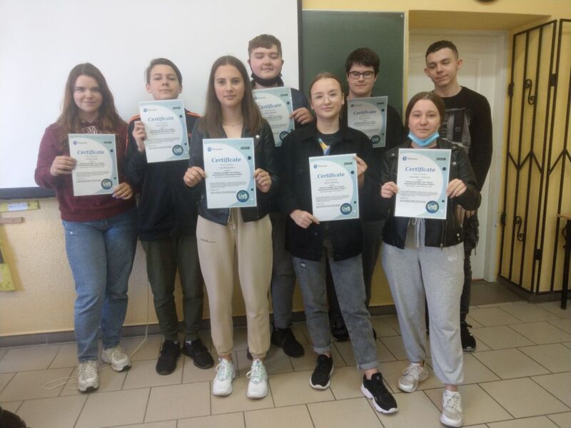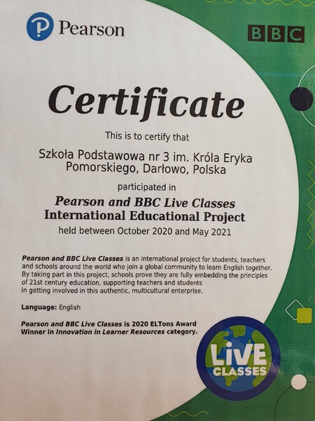 Uczestnicy lekcji otrzymali certyfikaty uczestnictwa w projekcie. Szkoła Podstawowa nr 3 im. Króla Eryka Pomorskiego również została uhonorowana takim certyfikatem.