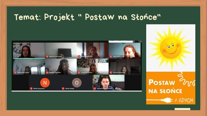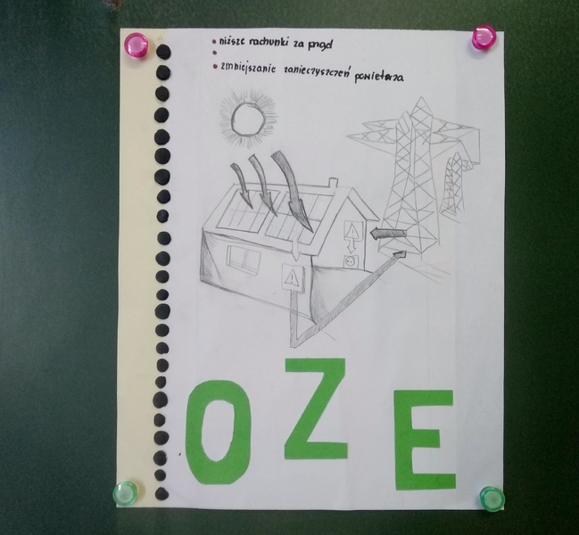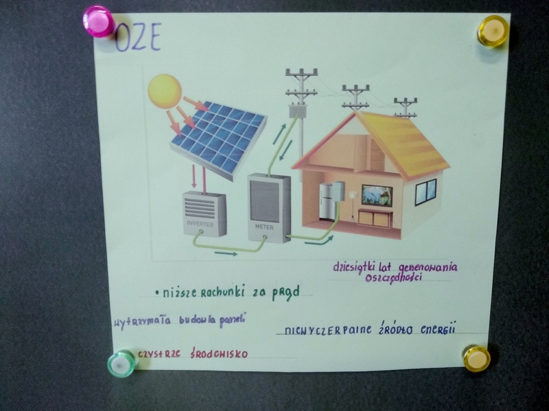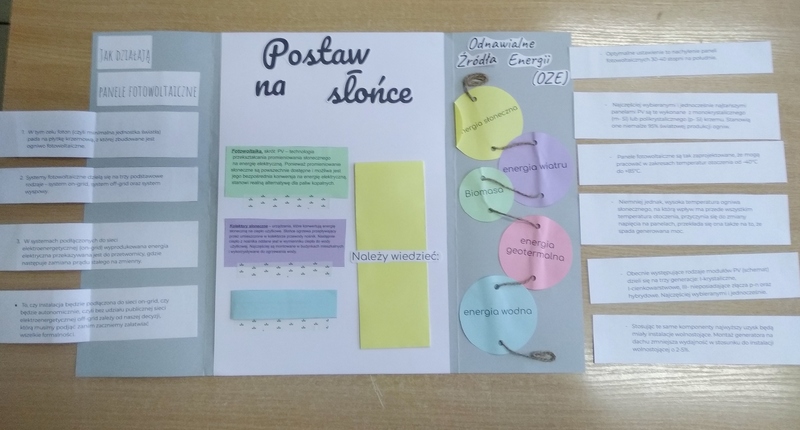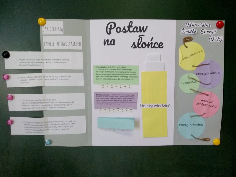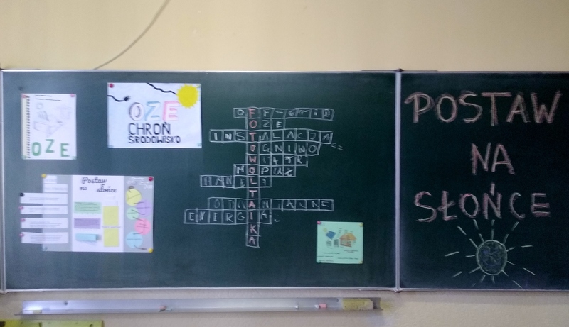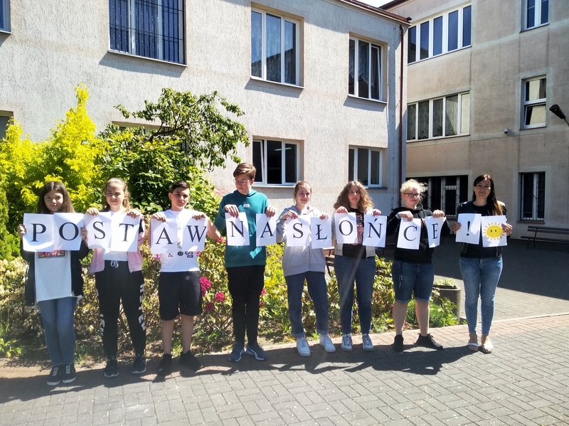 Na podsumowanie projektu „ Postaw na Słońce” uczniowie przygotowali akcję promocyjną OZE w swojej szkole, miejscowości i w sieci. Stworzyli plakaty, lapbooki, banery, ulotki, prezentację, nagrali filmik, a na lekcjach fizyki promowali OZE i fotowoltaikę wśród koleżanek i kolegów swojej klasy rozwiązując quizy oraz krzyżówki. Pozyskiwanie energii w tradycyjny sposób, czyli przez spalanie węgla, niesie ze sobą niezwykle szkodliwe skutki dla środowiska ze zmianami klimatycznymi i smogiem na czele. Wierzymy, że zmiana sposobu wytwarzania energii w Polsce, w tym przejście na mikroinstalacje OZE, przyczyni się do poprawienia stanu środowiska.