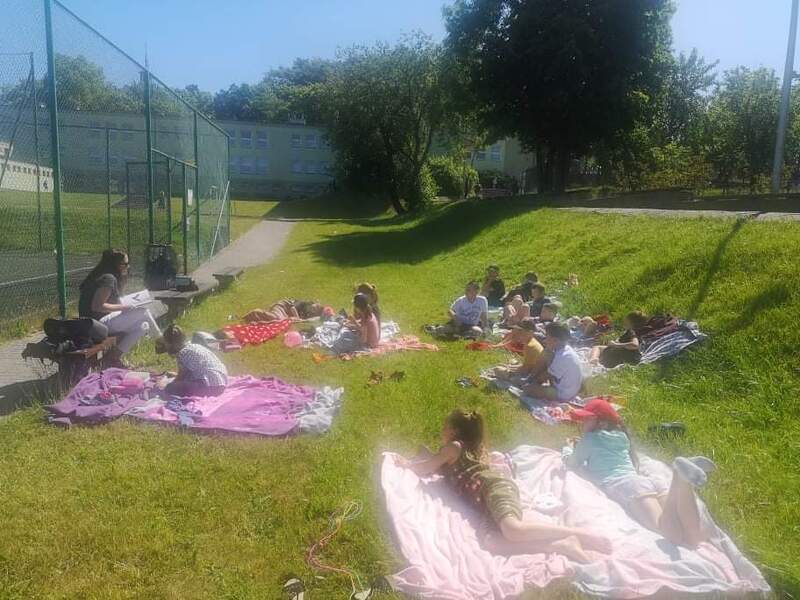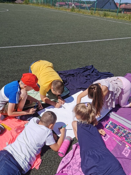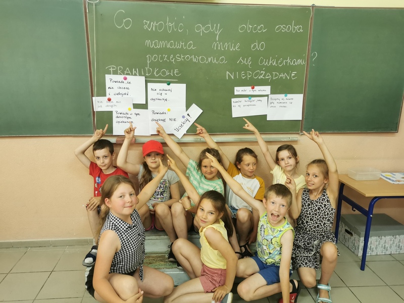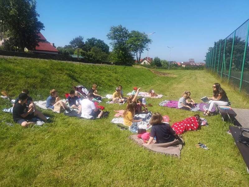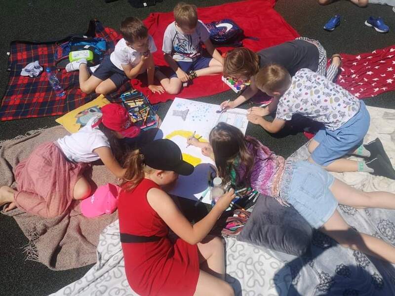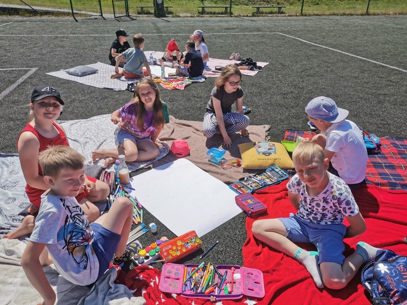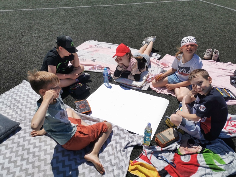 Lekcje na kocach „pod chmurką”? Jak najbardziej! Dzieci je uwielbiają. Zajęcia w każdym miejscu mogą być ciekawe i wartościowe. Bajkoterapia, odgrywanie ról i scenek, prace plastyczne, burza mózgów i praca w grupach – za pomocą metod aktywizujących klasa 2c realizowała działania profilaktyczne Programu „Cukierki” zorientowane na uczniów w sytuacjach zagrożenia.