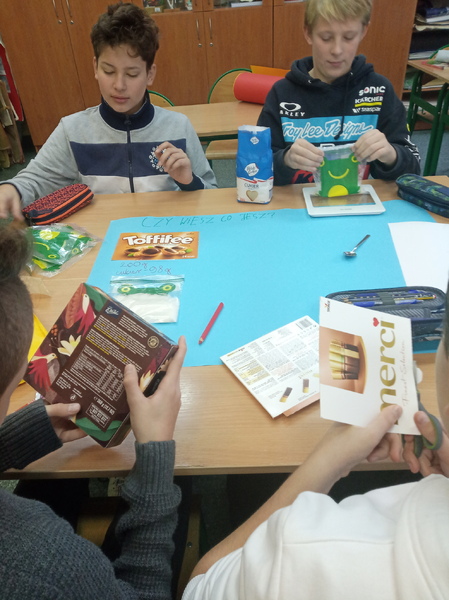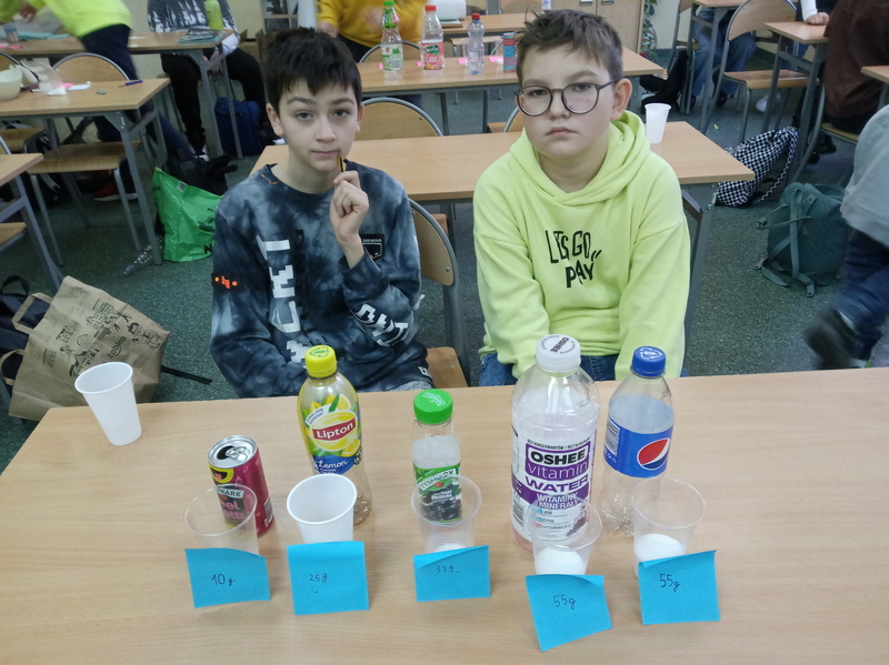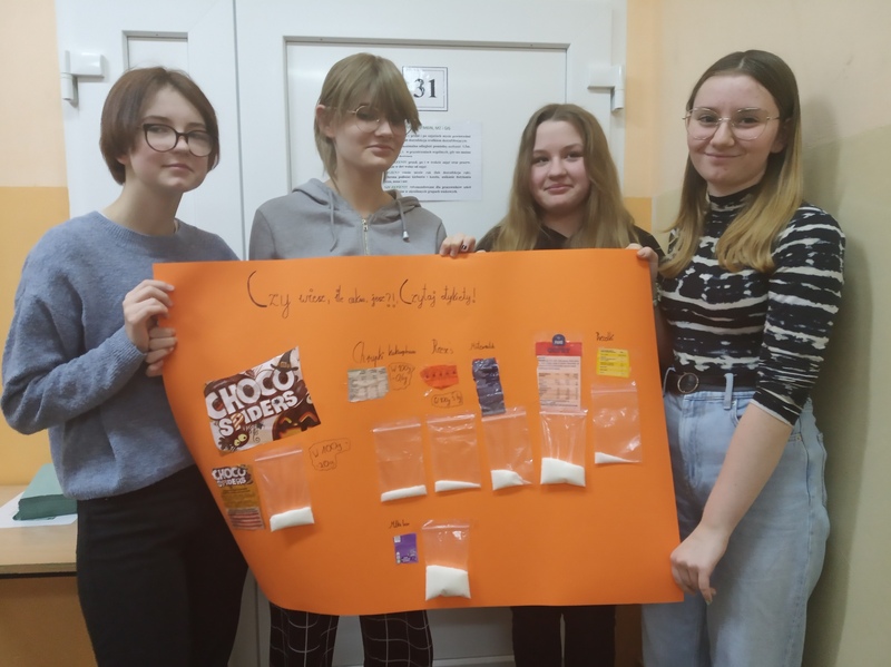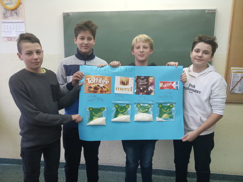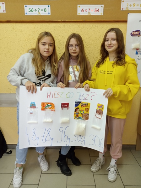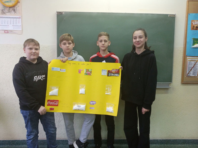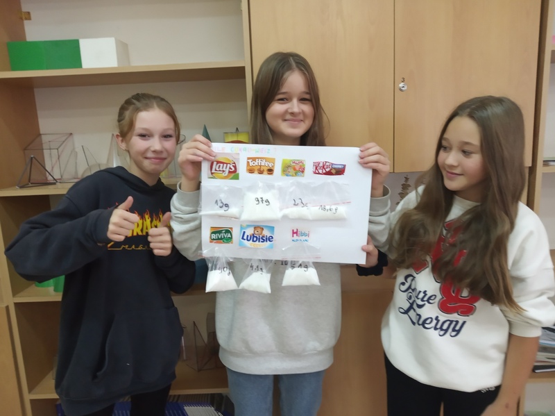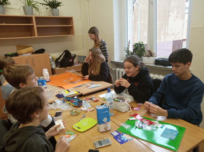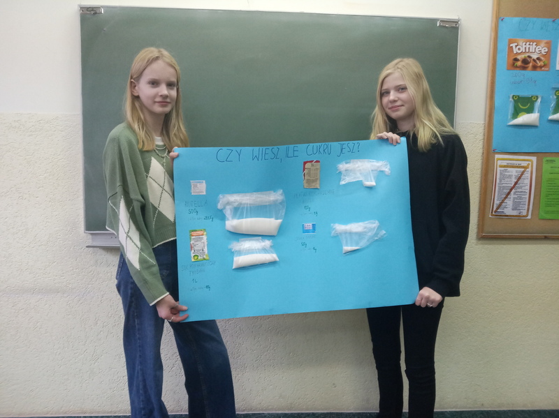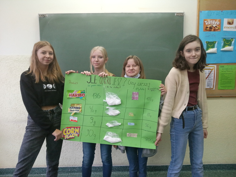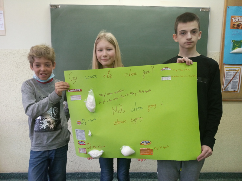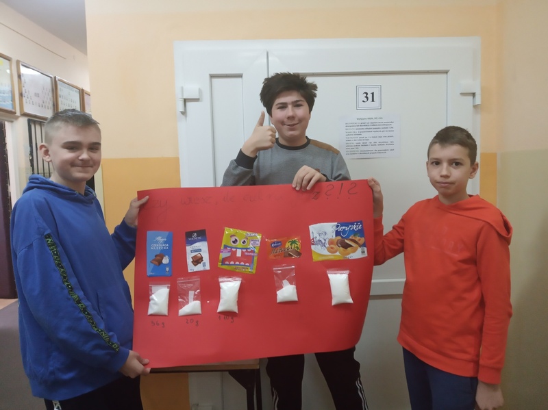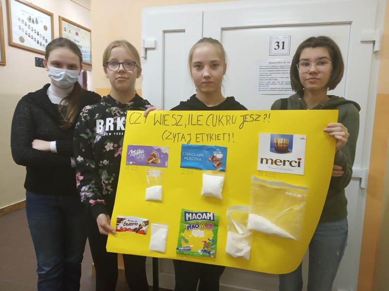 W ramach promocji zdrowia przez ostatnie tygodnie na zajęciach z wychowawcą oraz lekcjach biologii uczniowie klas 7A, 7B, 7C i 7D uczyli się czytać ze zrozumieniem etykiety produktów spożywczych, poznawali wartości odżywcze codziennie spożywanych artykułów oraz zdobywali wiedzę na temat wpływu witamin i soli mineralnych na zdrowie człowieka. Zadaniem podsumowującym wiedzę i umiejętności uczniów było odczytywanie i wyliczanie, ile dodanego cukru znajduje się w opakowaniu ulubionych przekąsek, słodyczy czy napoi. Uczniowie obliczali i ważyli porcje cukru, a następnie wykonywali plakaty lub prezentację.