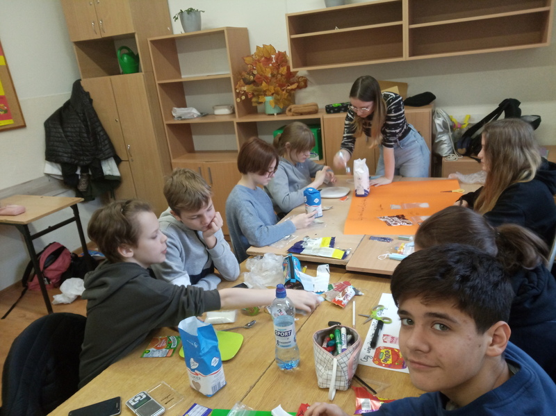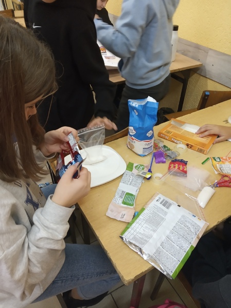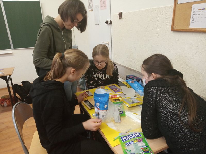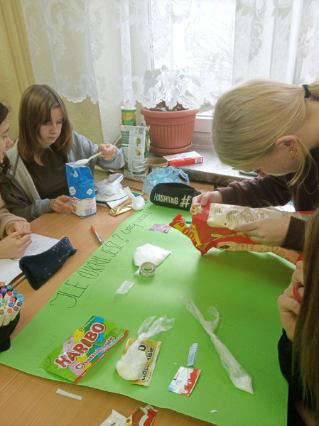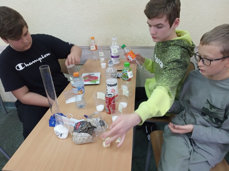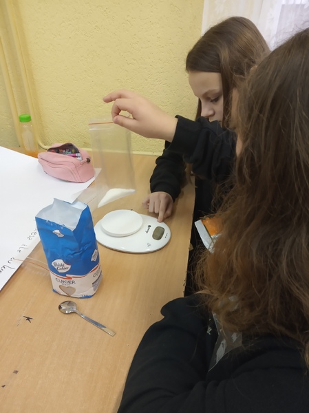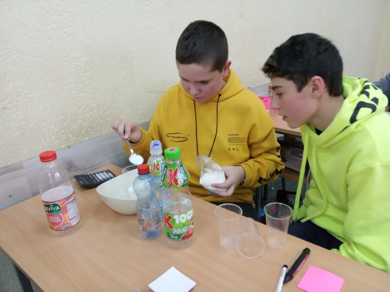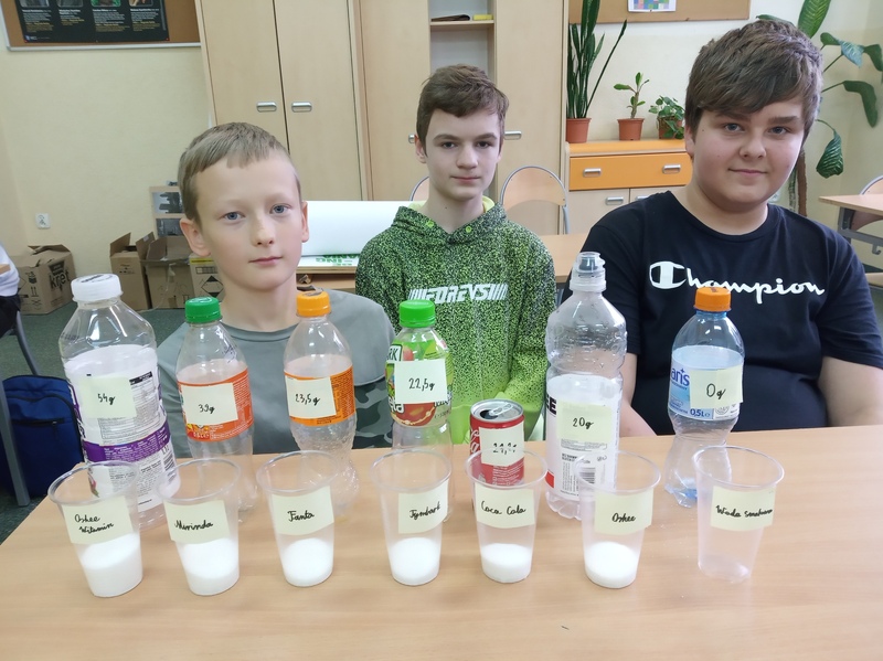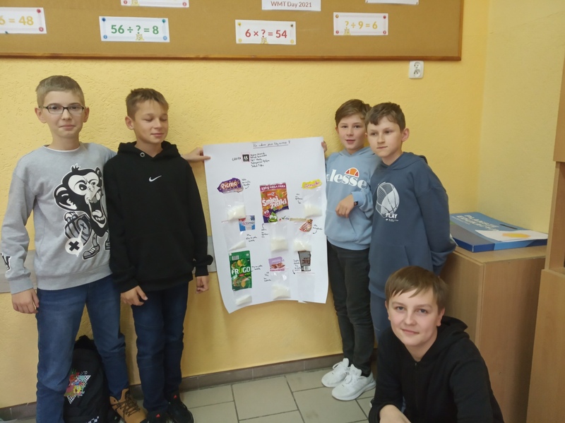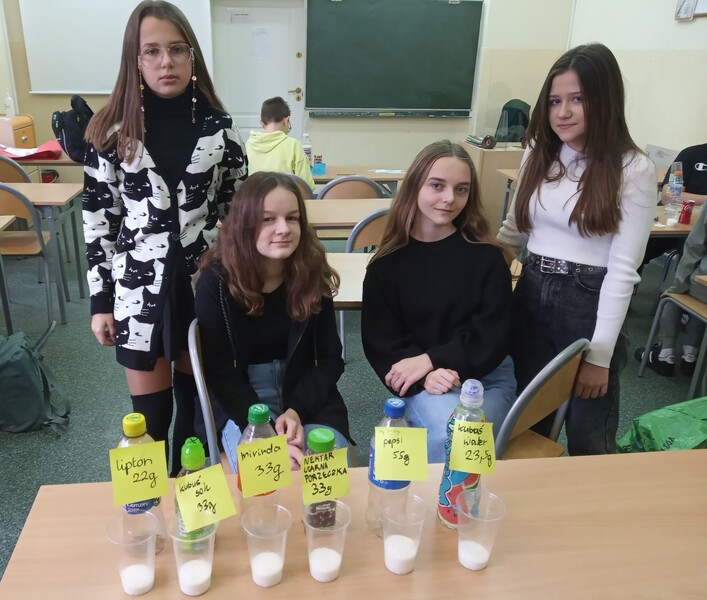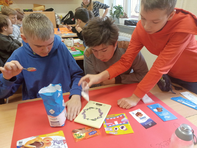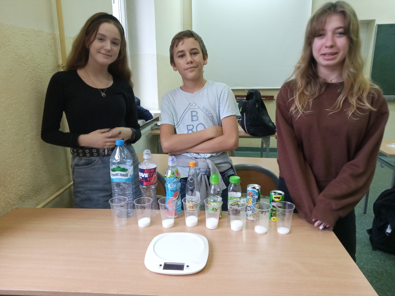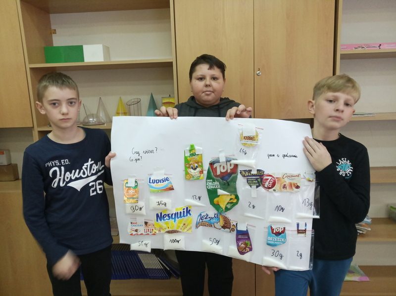 W ramach promocji zdrowia przez ostatnie tygodnie na zajęciach z wychowawcą oraz lekcjach biologii uczniowie klas 7A, 7B, 7C i 7D uczyli się czytać ze zrozumieniem etykiety produktów spożywczych, poznawali wartości odżywcze codziennie spożywanych artykułów oraz zdobywali wiedzę na temat wpływu witamin i soli mineralnych na zdrowie człowieka. Zadaniem podsumowującym wiedzę i umiejętności uczniów było odczytywanie i wyliczanie, ile dodanego cukru znajduje się w opakowaniu ulubionych przekąsek, słodyczy czy napoi. Uczniowie obliczali i ważyli porcje cukru, a następnie wykonywali plakaty lub prezentację.