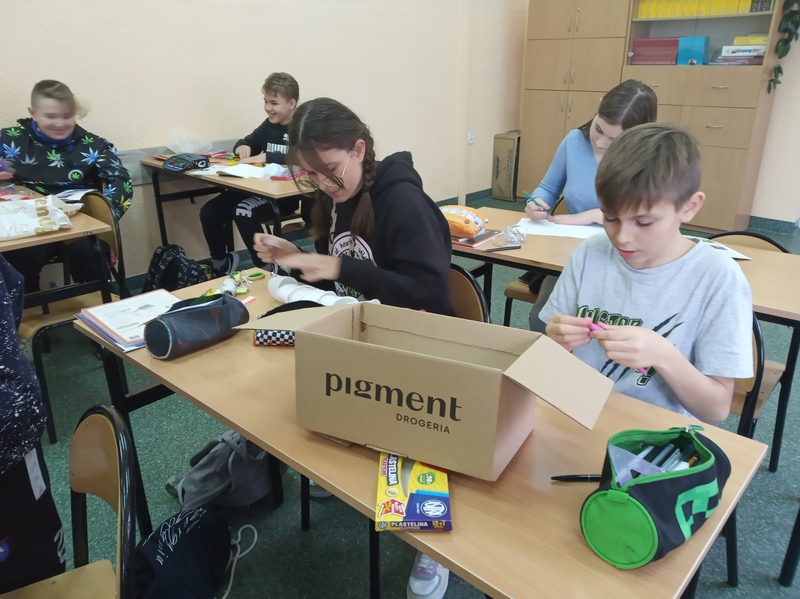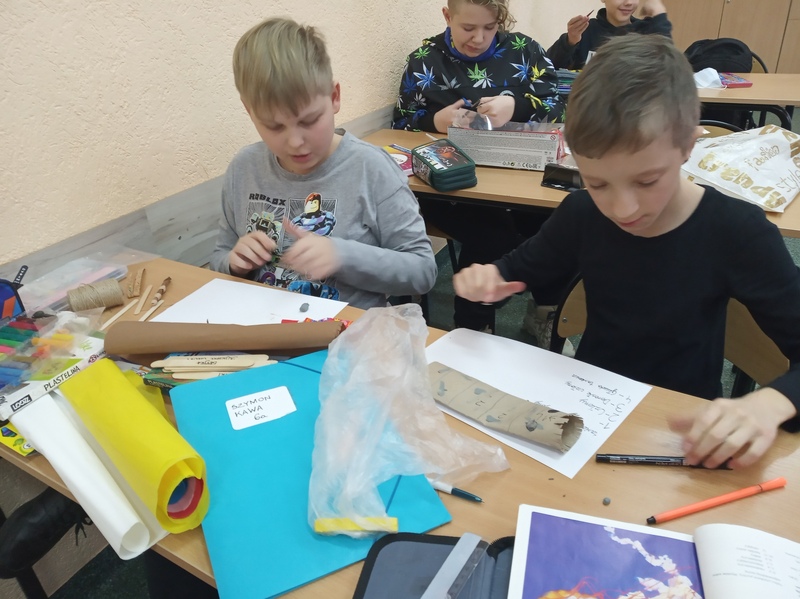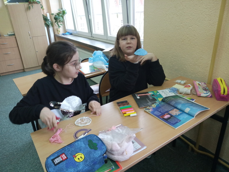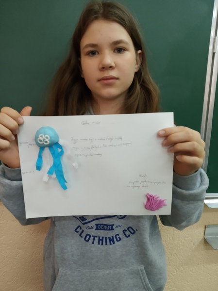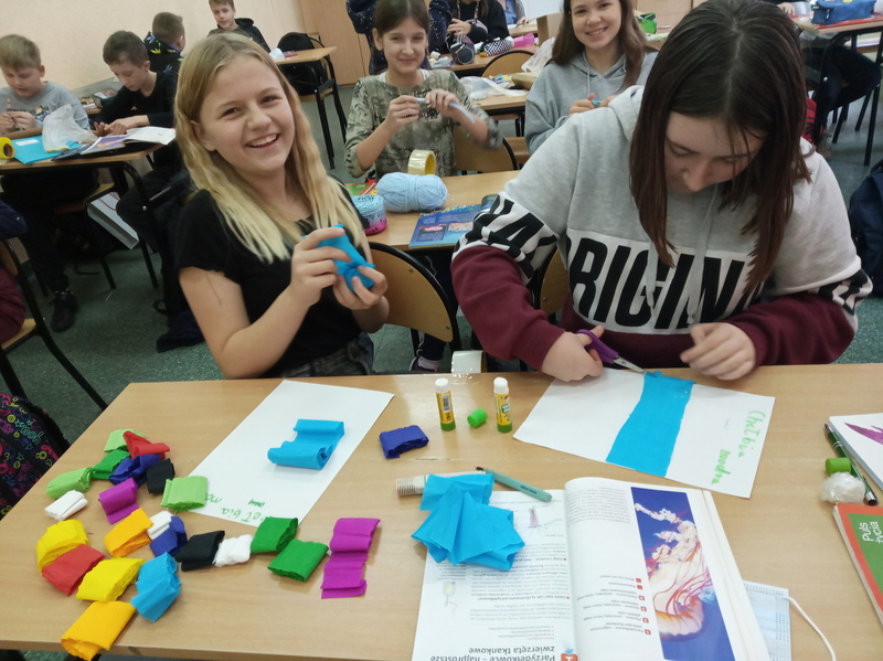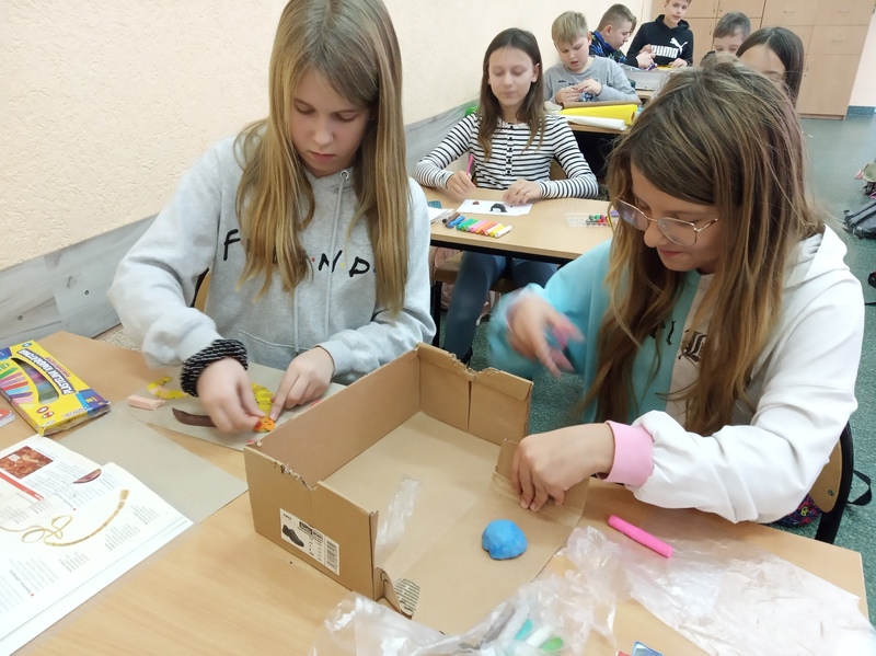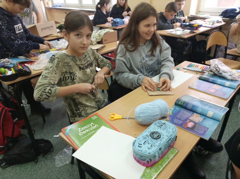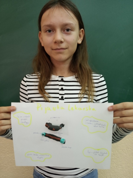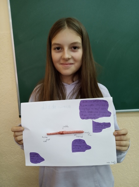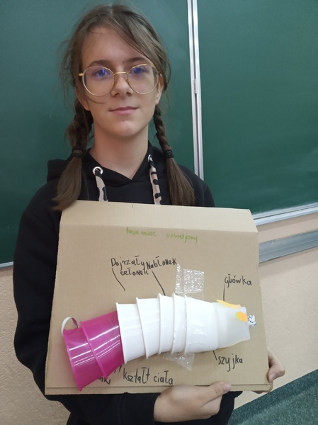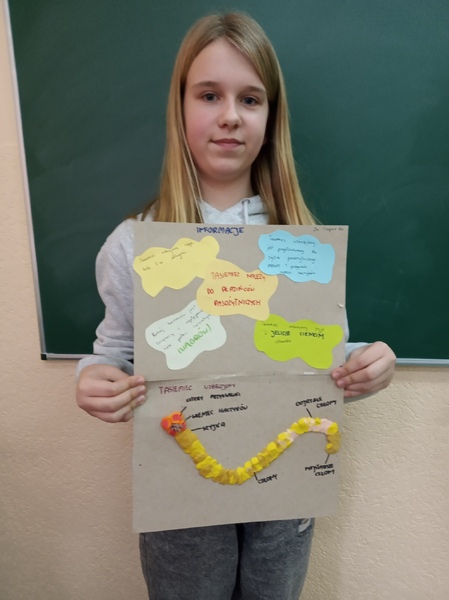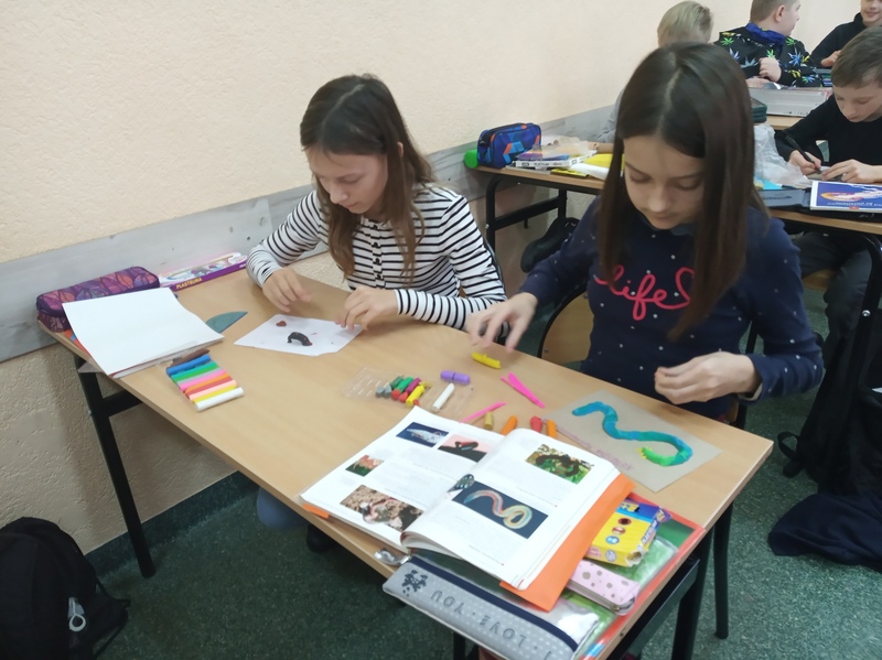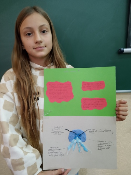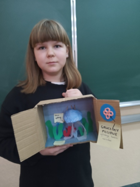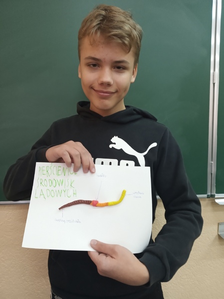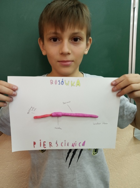 Z przygotowanych wcześniej materiałów powstały modele chełbii modrej, korala szlachetnego, nereidy różnokolorowej, tasiemca uzbrojonego i nieuzbrojonego, dżdżownicy i pijawek. Uczniowie do wykonanego modelu wykonali także opis korzystając z ilustracji w podręczniku. Uczniowie wykazali się kreatywnością, ale także dokładnością w odtwarzaniu detali budowy poszczególnych organizmów. Oto rezultaty pracy uczniów klasy 6A.