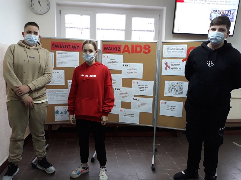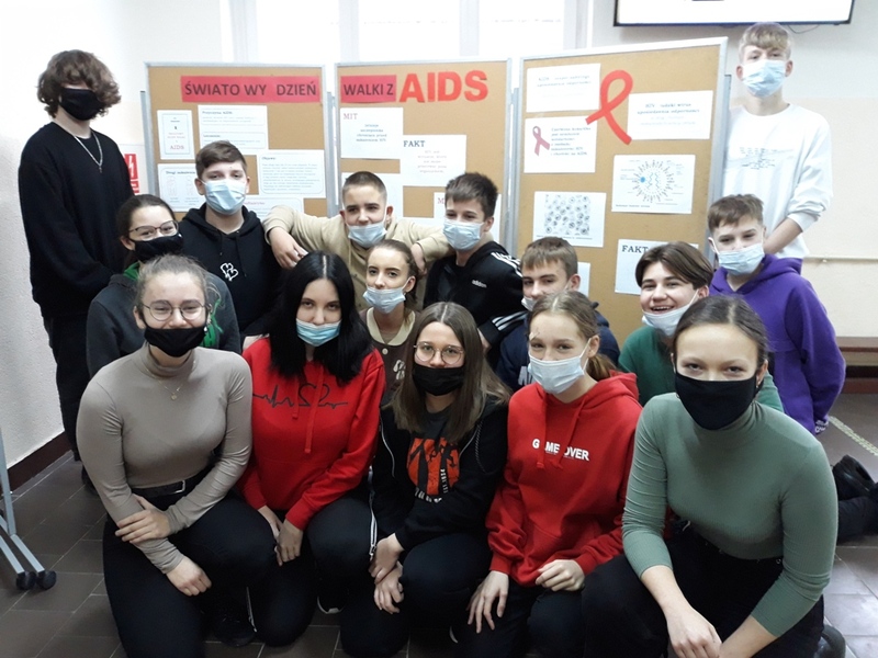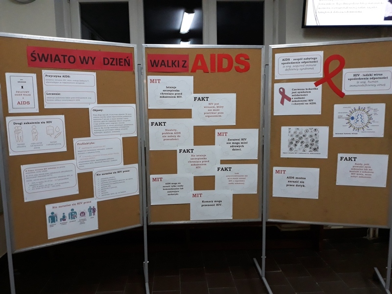 Zebrano informacje na temat choroby oraz wywołującego ją wirusa HIV. Na holu szkolnym przygotowano gazetkę, która zawierała wiele przydatnych informacji. AIDS to zespół nabytego niedoboru (rzadziej upośledzenia) odporności, jest końcowym stadium zakażenia HIV i charakteryzuje się wyniszczeniem układu immunologicznego (odpornościowego). Skutkiem choroby jest zwiększona zachorowalność na grzybice, nietypowe zapalenia płuc i niektóre formy nowotworów, mogące zakończyć się śmiercią pacjenta. Rocznie na AIDS umiera ok. 2 mln osób. Obecnie na świecie żyje ponad 40 milionów ludzi chorych na HIV/AIDS.