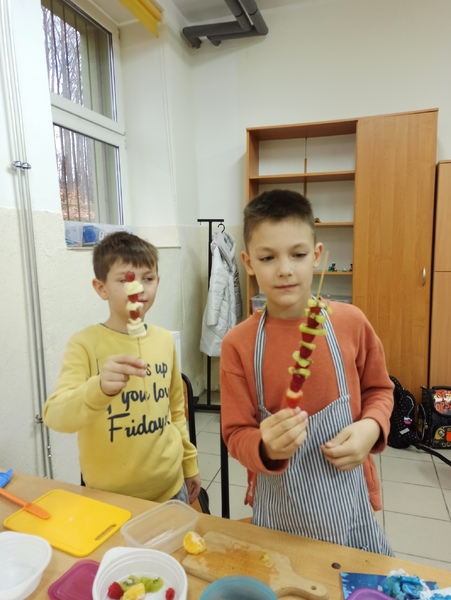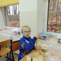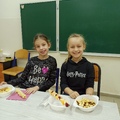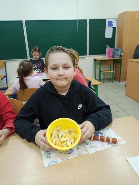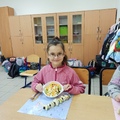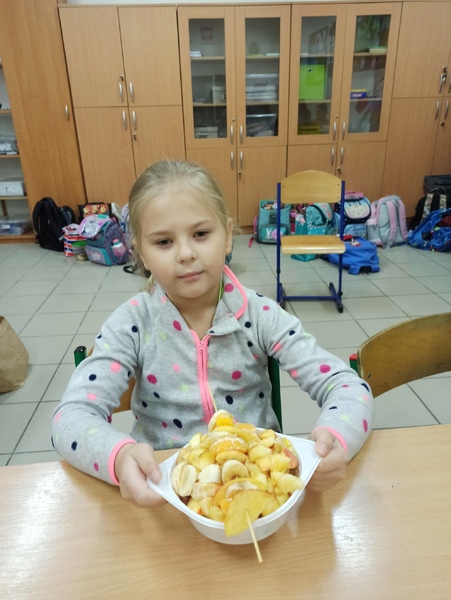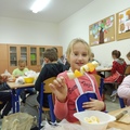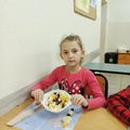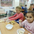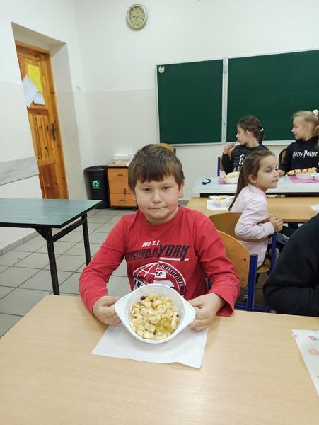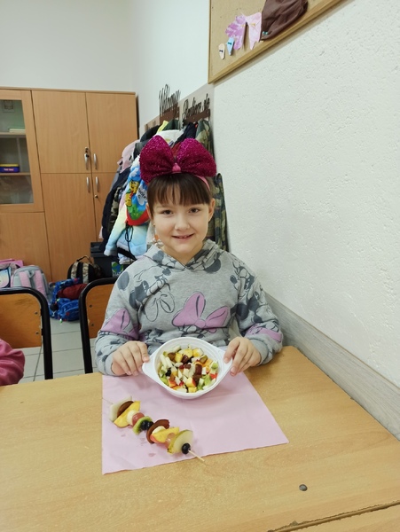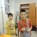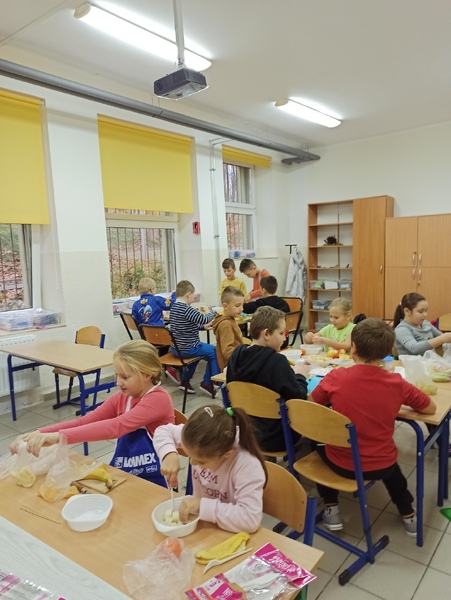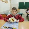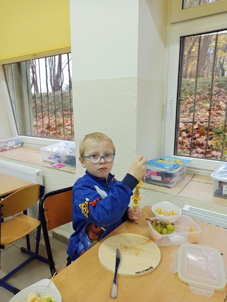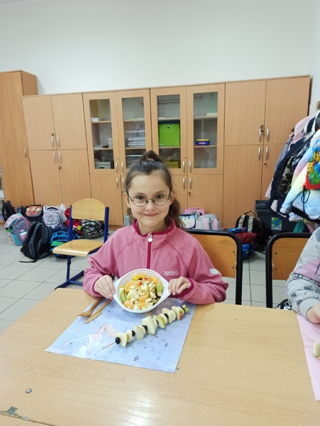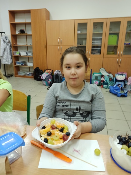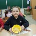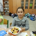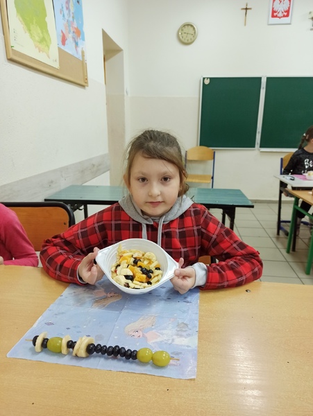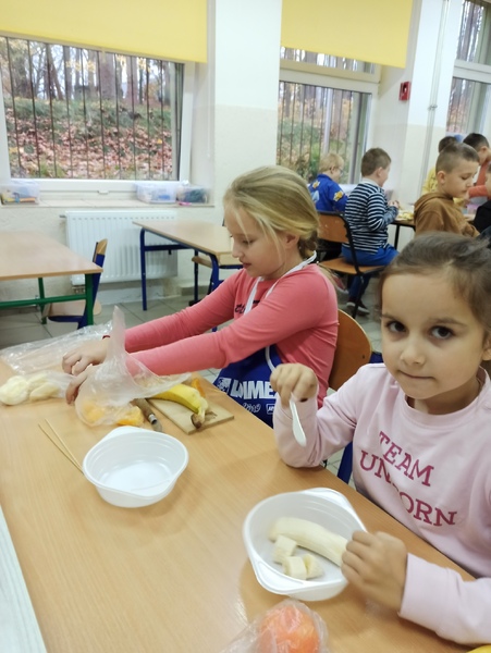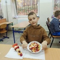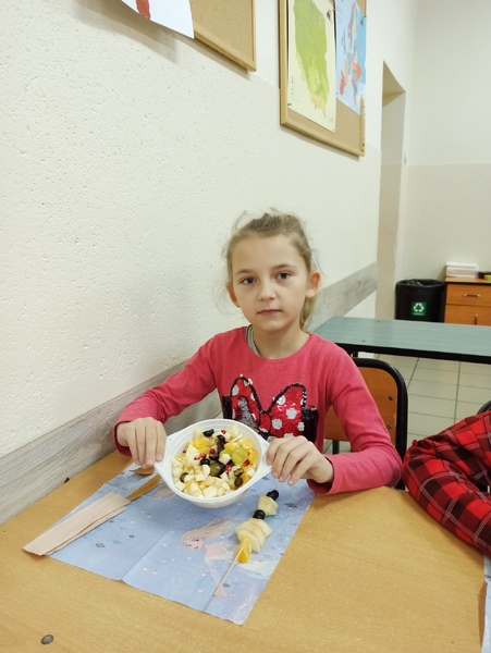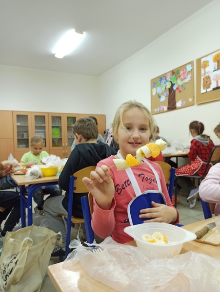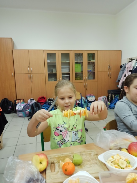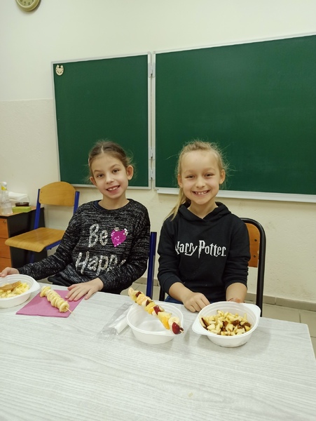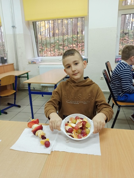 W listopadzie uczniowie klasy 2e, po cyklu lekcji o zdrowym odżywianiu postanowili samodzielnie wykonać owocową sałatkę i owocowe szaszłyki. Praca szła bardzo sprawnie i z przyniesionych różnorodnych owoców powstały smaczne i zdrowe desery. Zjedzone zostały z wielkim apetytem podczas przerwy śniadaniowej.