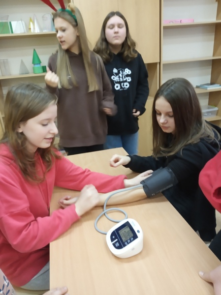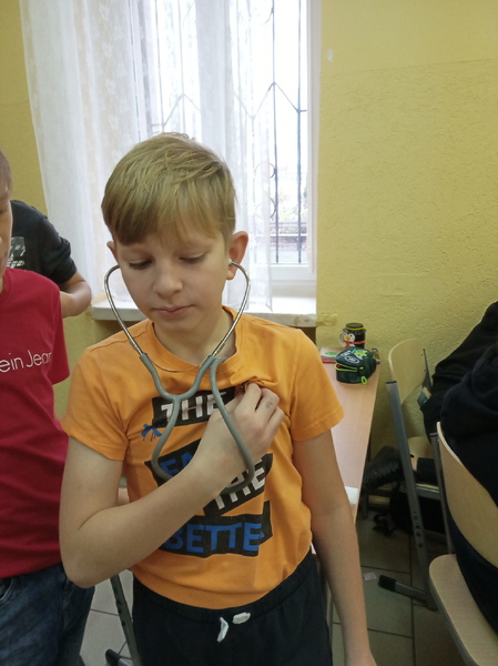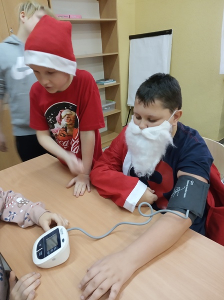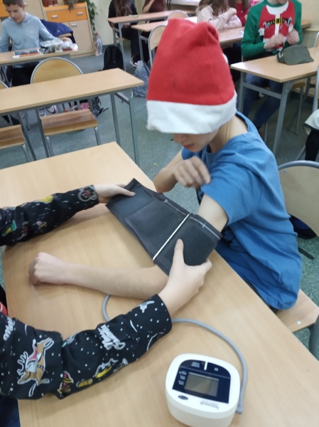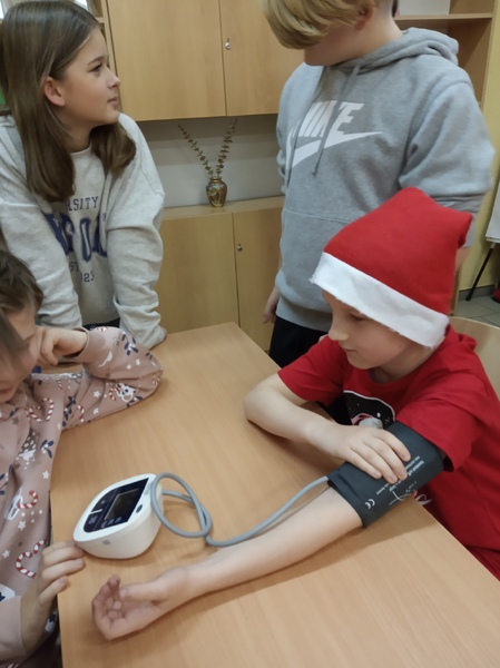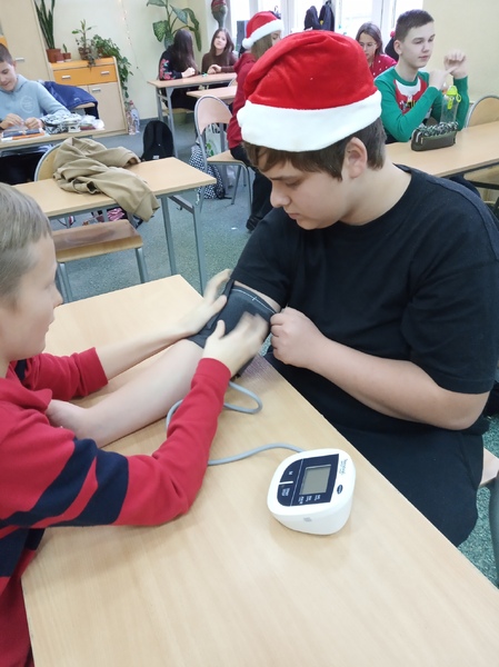 Mikołajki to czas podarunków, miłych słów i wzruszeń. Nasze serce jest przepełnione radością i bije szybko, bo nie możemy doczekać się niespodzianki. Dlatego też na lekcjach biologii uczniowie klas 7ych przyjrzeli się bliżej funkcjom serca. Na początku zajęć otrzymali instrukcję, w jaki sposób dokonuje się prawidłowego pomiaru ciśnienia krwi za pomocą automatycznego ciśnieniomierza, jakie są wartości optymalne, a przekroczenie których, może świadczyć o chorobie. Uczniowie mieli okazję samodzielnie dokonać pomiaru ciśnienia krwi u koleżanki lub kolegi, dowiedzieć się, jakie sami mają wartości ciśnienia krwi oraz posłuchać przez stetoskop uderzeń swojego serca. Przekonali się, że wartość tętna zmienia się w zależności od wielu czynników takich jak stres, emocje czy aktywność fizyczna. Podczas wysiłku puls rośnie, dochodząc nawet u niektórych do 160 uderzeń na minutę, gdy w czasie spoczynku przyjmował wartości ok. 70-80 uderzeń na minutę. Warto zatem kontrolować wartości ciśnienia tętniczego, aby uniknąć niebezpiecznych dla naszego zdrowia chorób związanych z nieprawidłową wartością ciśnienia.