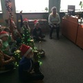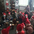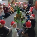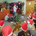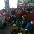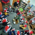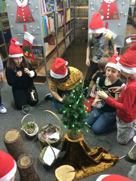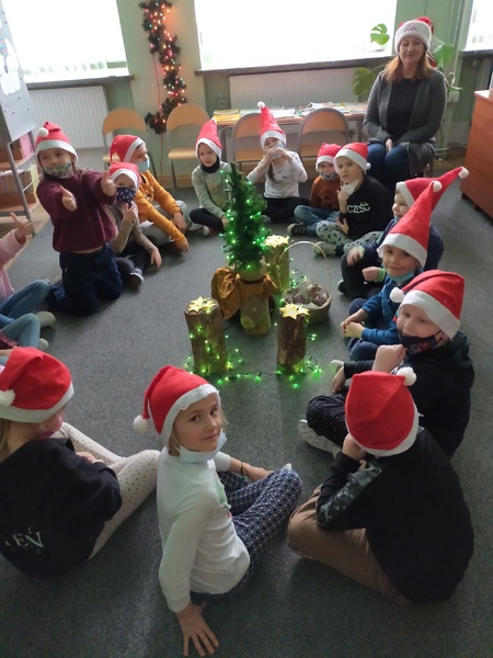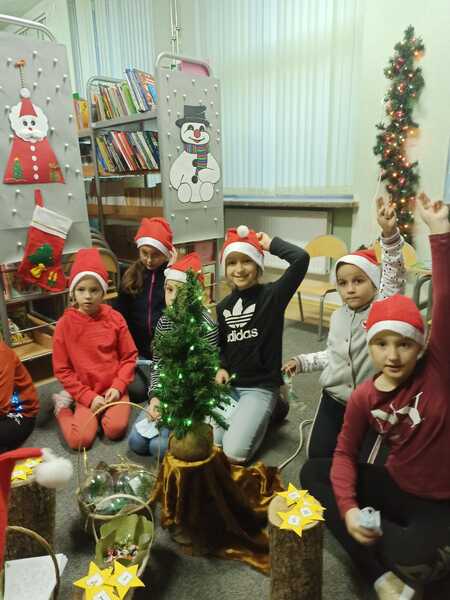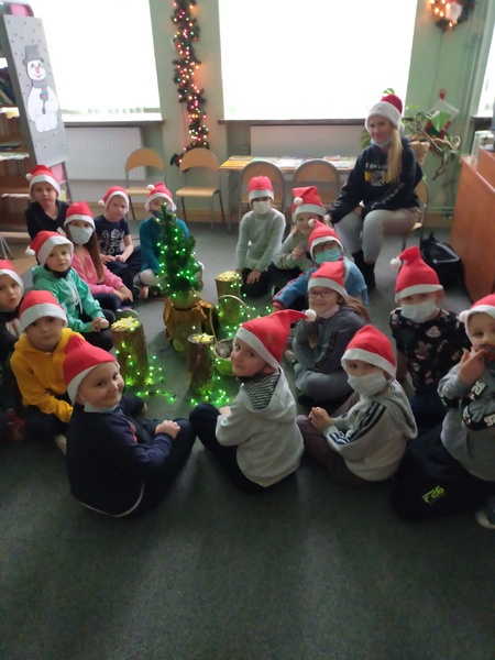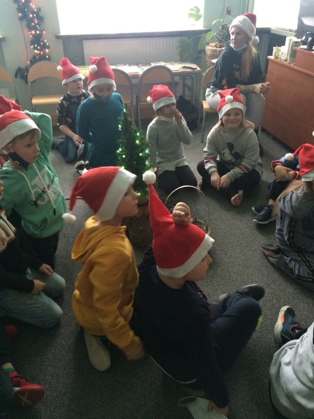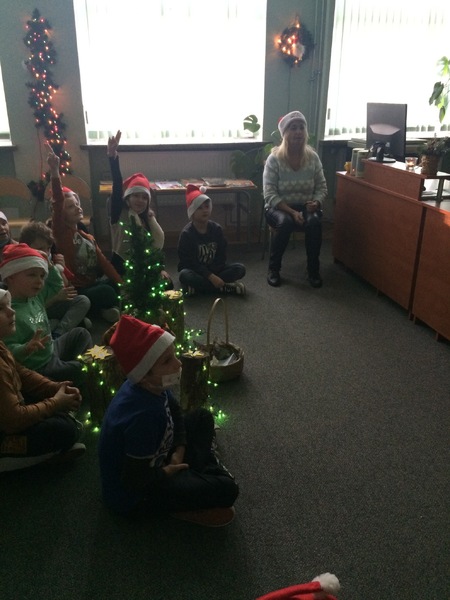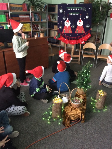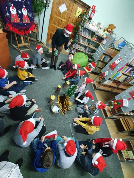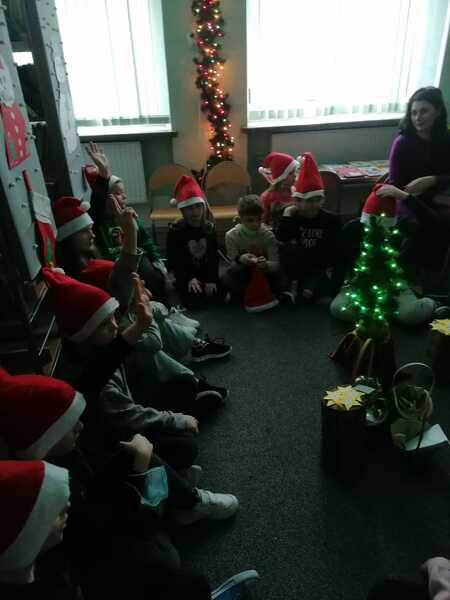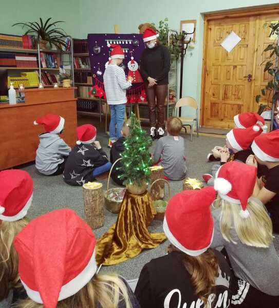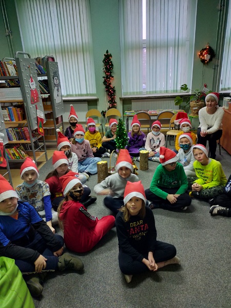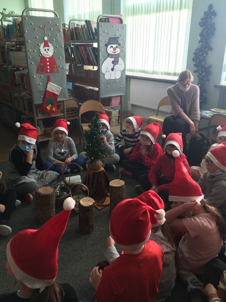 Zapach igliwia, migoczące światełka i płynące w tle dźwięki kolęd stworzyły grudniowy, magiczny nastrój szkolnej biblioteki. Dopełnieniem tego, była wizyta najmłodszych uczniów, którzy ubrani w czerwone, mikołajowe czapeczki uczestniczyli w zabawach czytelniczych związanych z nadchodzącymi świętami. Dodatkową atrakcją było wspólne czytanie świątecznego opowiadania. Na zakończenie wszystkie dzieci otrzymały upominki pozostawione przez Mikołaja.