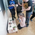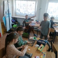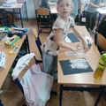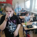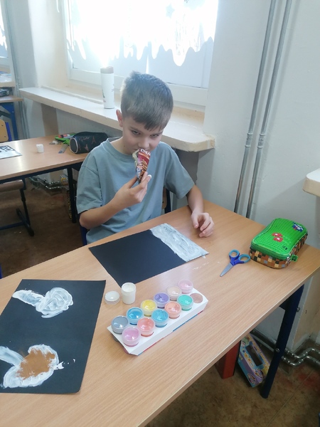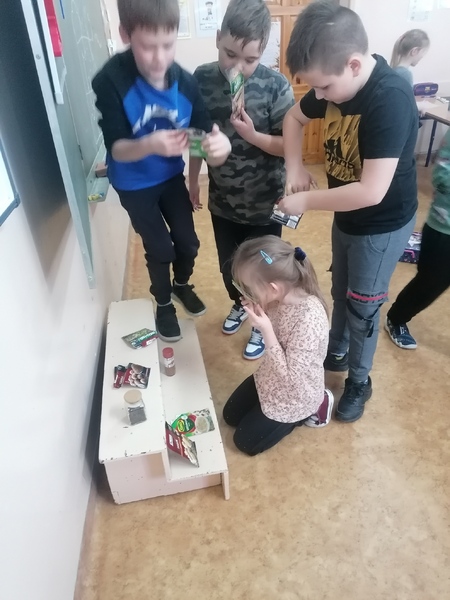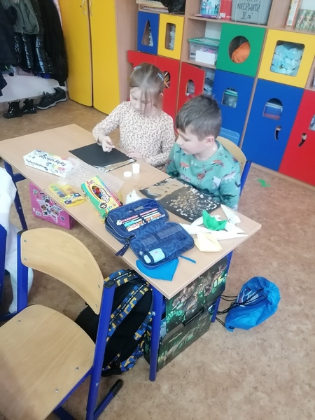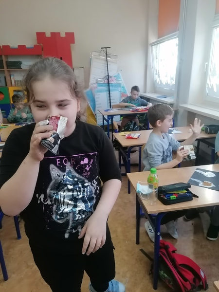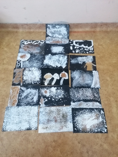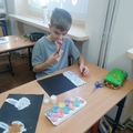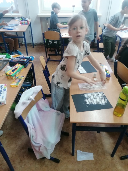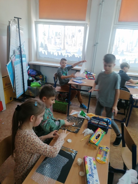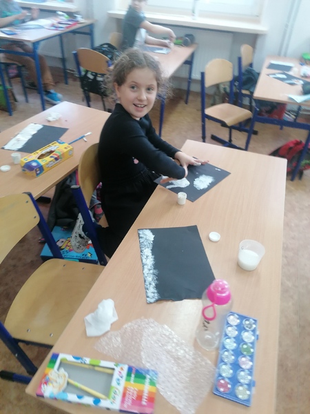 W poniedziałek, podczas zajęć plastycznych, uczniowie malowali przy użyciu wielu zmysłów. Tematyką pracy była zima. Trudność zadania polegała na tym, że uczniowie musieli przydzielić sobie zadania. Powstały trzy grupy, a każda osoba w grupie dodawała inną część pejzażu, do czego mogła użyć tylko dłoni i palców rąk. Uczniowie mieli okazję poznać nową technikę z wykorzystaniem folii bąbelkowej, która była wspólną wizją płatków śniegu. Do ozdobienia swoich prac użyli wielu przypraw, dzięki którym pobudzili zmysł powonienia.
