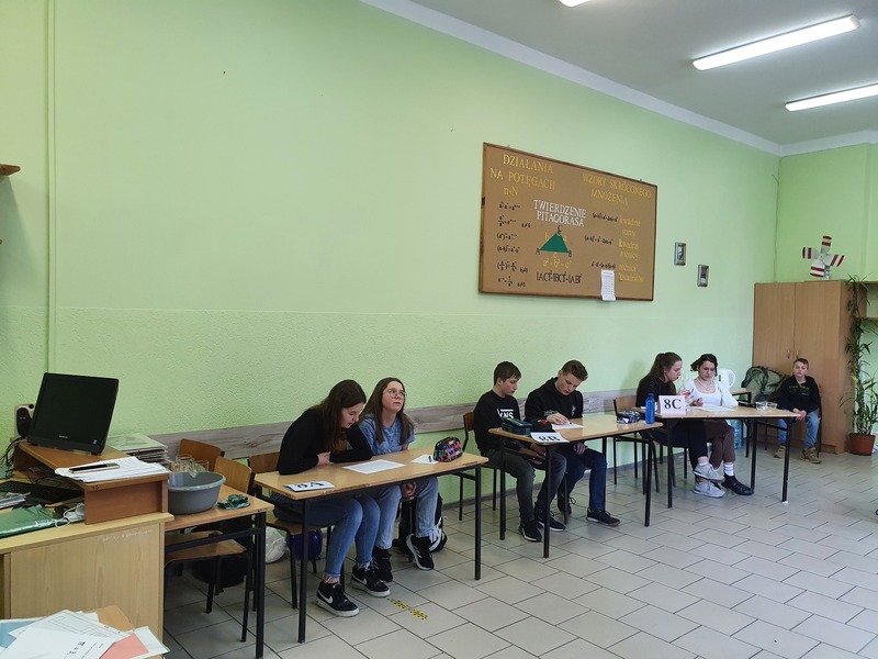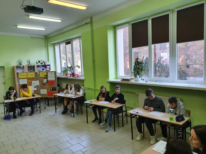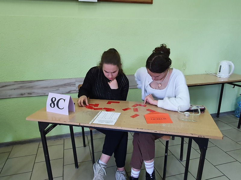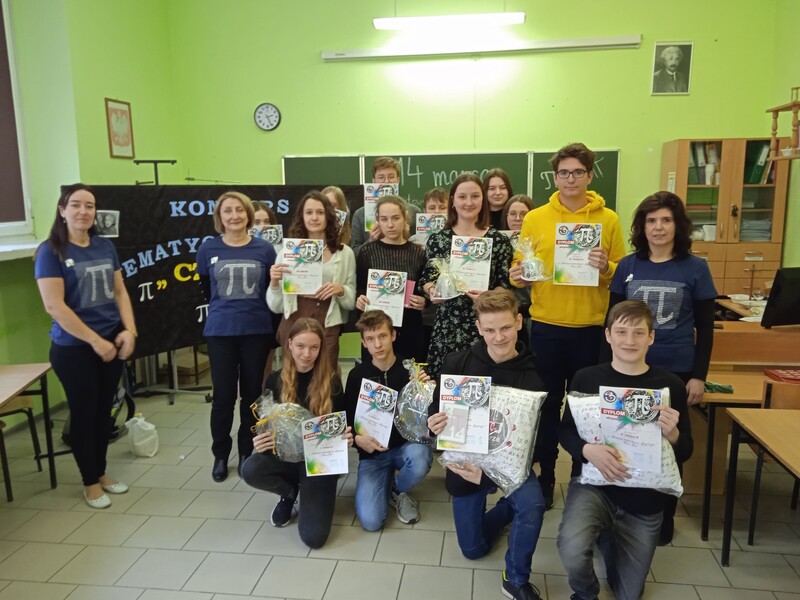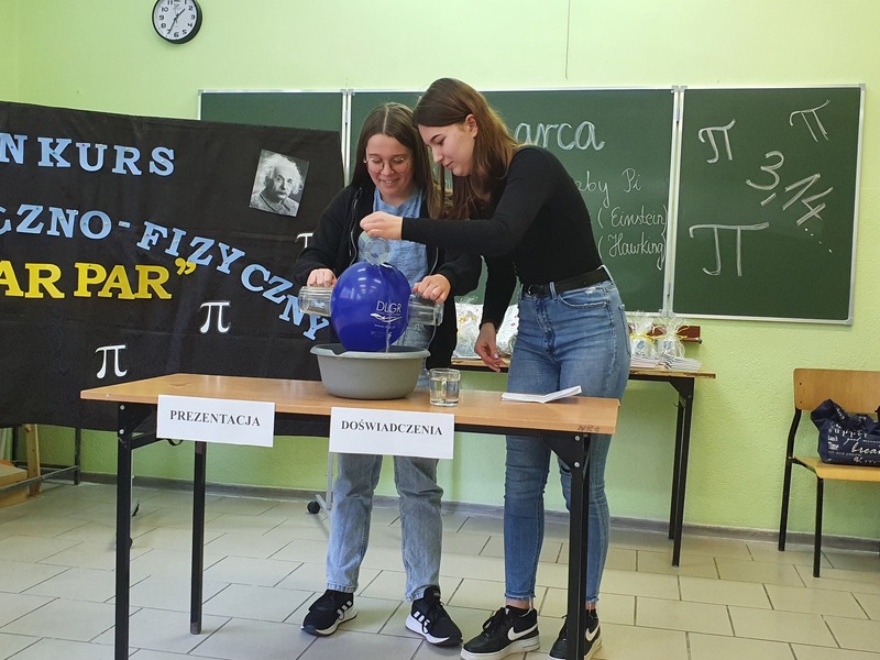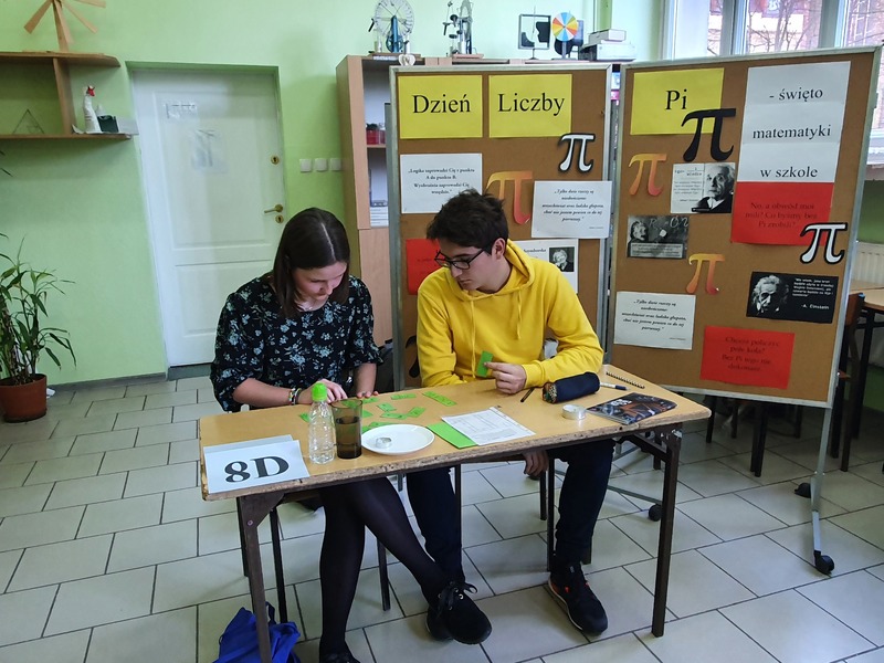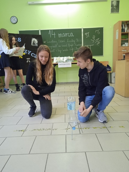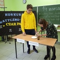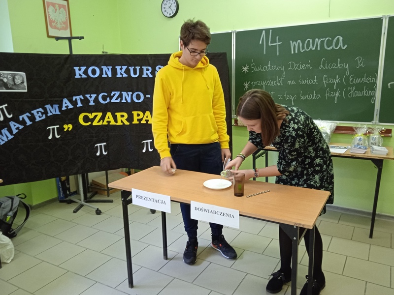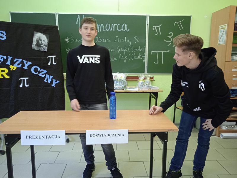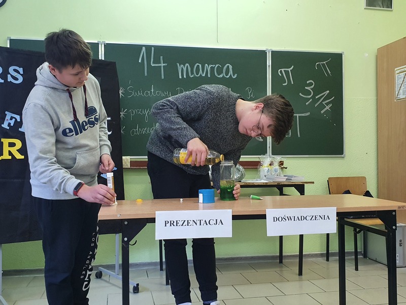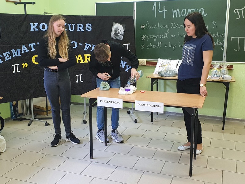 Świętowanie zaczęliśmy od krzyżówki matematycznej. Kolejne konkurencje to domino dotyczące wyrażeń algebraicznych oraz konkurs na zapamiętanie najdłuższego rozwinięcia liczby Pi. Ósmoklasiści zabawili się również w Młodych Einsteinów i zaprezentowali ciekawe doświadczenia fizyczne. W interesujący sposób zostały przedstawione doświadczenia, tj. balon trzymający szklanki, rakieta, swobodny spadek ciał, nurek Kartezjusza, lampa lawa, gasnąca świeczka. Nad przebiegiem konkursu czuwało jury w składzie: pani Marta Sołtan, pani Magdalena Kasprzykowska, wicedyrektor Katarzyna Łusiewicz.