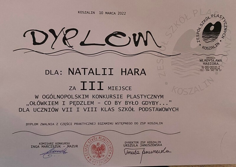 Uczennica naszej szkoły Natalia Hara z klasy 8A wzięła udział w ogólnopolskim konkursie plastycznym „Ołówkiem i pędzlem - co by było gdyby …”, który odbył się w Zespole Szkół Plastycznych im. Władysława Hasiora w Koszalinie. Natalia pomyślnie przeszła przez I etap konkursu polegający na wyłonieniu najlepszych spośród 51 prac uczniów 7 i 8 klas szkół podstawowych. W II etapie uczennica wykonała prace z rysunku (martwa natura), malarstwa (martwa natura) oraz rzeźby (interpretacja tematu).