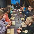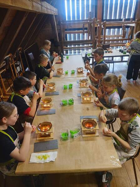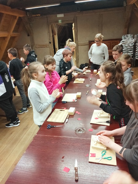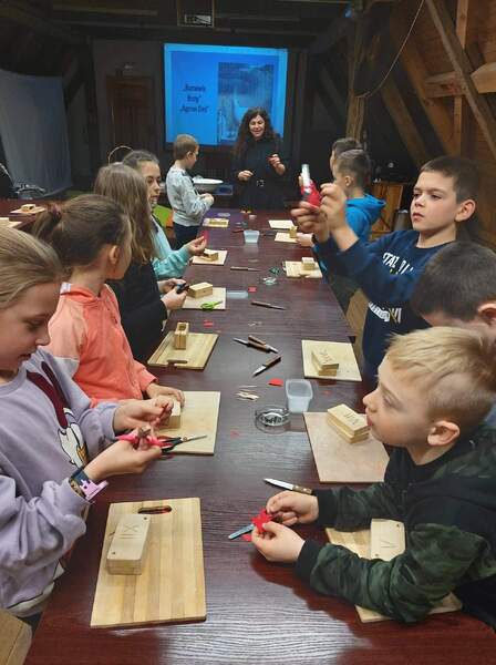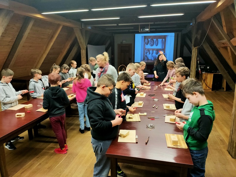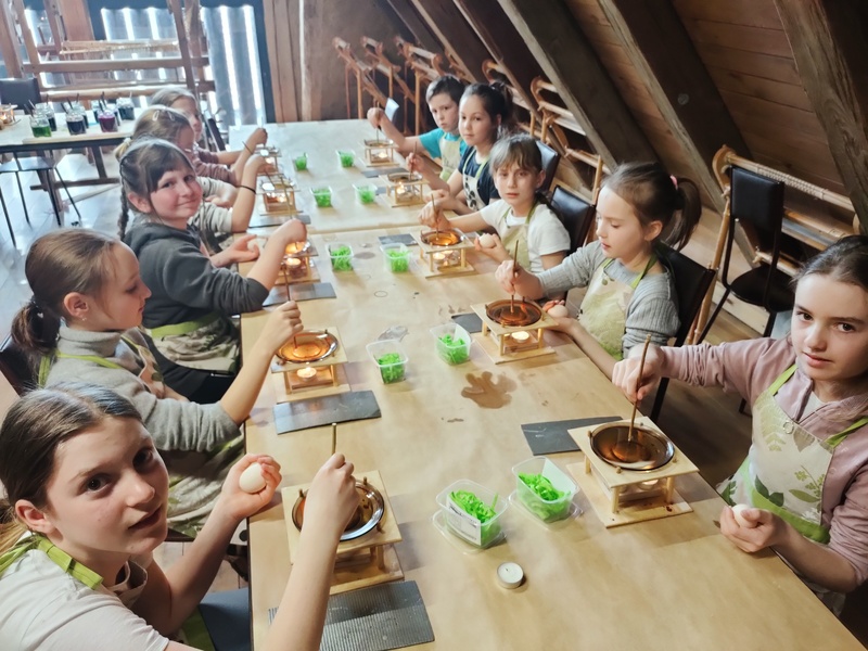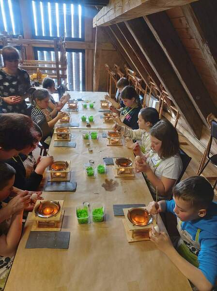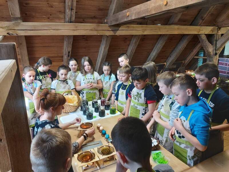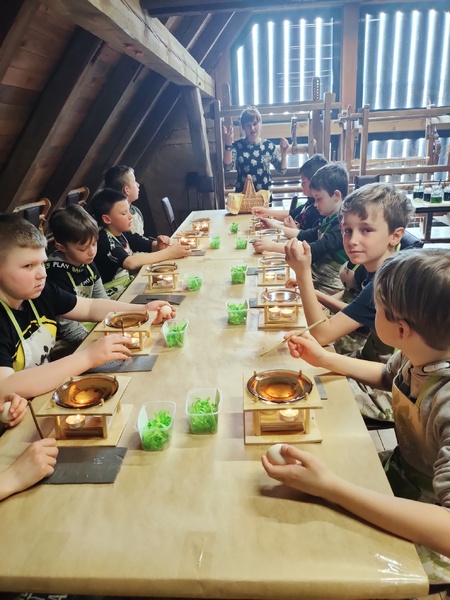 Na drugich warsztatach dowiedzieli się o tym, jakie znaczenie w tradycji ma pisanka wielkanocna. Usłyszeli opowieści o zwyczajach i wierzeniach wielkanocnych, o świątecznej i pełnej bogactwa symbolice jajka. Pani prowadząca warsztaty zdradziła jak wyczarować pisankę, jak nadać jej kolor, a także, jakie sekrety ukryte są w barwach i bogatych wzorach tych małych dzieł sztuki. Uczniowie poznali dekoracje i techniki zdobienia jaj z różnych regionów polski oraz samodzielnie wykonali dawnymi technikami pisankę wielkanocną.