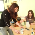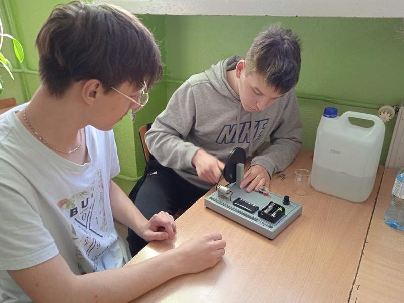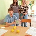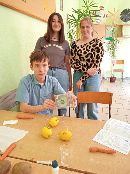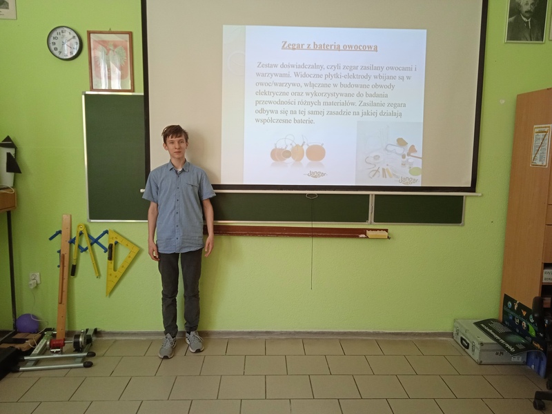 Kolejny zestaw doświadczalny to „Zegar zasilany owocami i warzywami”. Płytki-elektrody wbijane były w owoc/warzywo, włączane w budowane obwody elektryczne oraz wykorzystywane do badania przewodności różnych materiałów. Zasilanie zegara odbywało się na tej samej zasadzie na jakiej działają współczesne baterie.