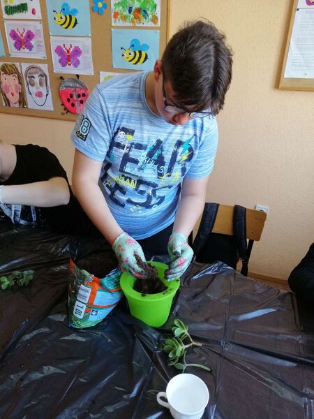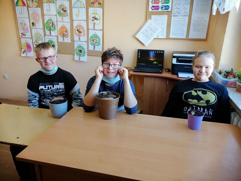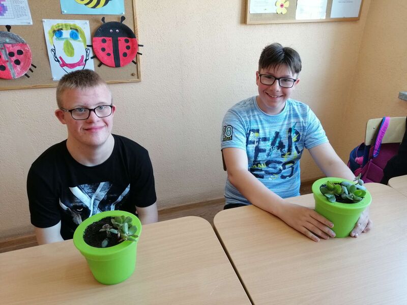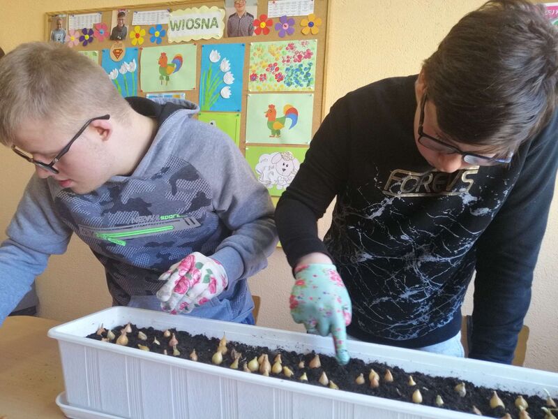 Dzieci ze specjalnymi potrzebami edukacyjnymi przez cały rok szkolny prowadziły klasowy kącik przyrody. W październiku zabawiły się w małych ekologów i zasadziły kasztany, żołędzie i szyszki. Cierpliwie pielęgnowały je, by na wiosnę zobaczyć młode roślinki. Wiosną zasadziły cebulę. Nie mogły się doczekać, aż będą mogły zrobić kanapki z wyhodowanym przez siebie pysznym i zdrowym szczypiorkiem. W kwietniu uczniowie zasiali rzeżuchę, była ona ozdobą wielkanocnych koszyczków. W maju z kolei zasadzili drzewka szczęścia. Te rośliny doniczkowe dzieci zamierzają pielęgnować, tak by podarować komuś bliskiemu jako prezent. Hodując rośliny dzieci prowadzą obserwację, poznają cykl rozwoju roślin, uczą się odpowiedzialności i cierpliwości oraz troski o środowisko naturalne.