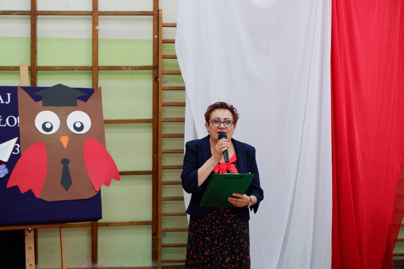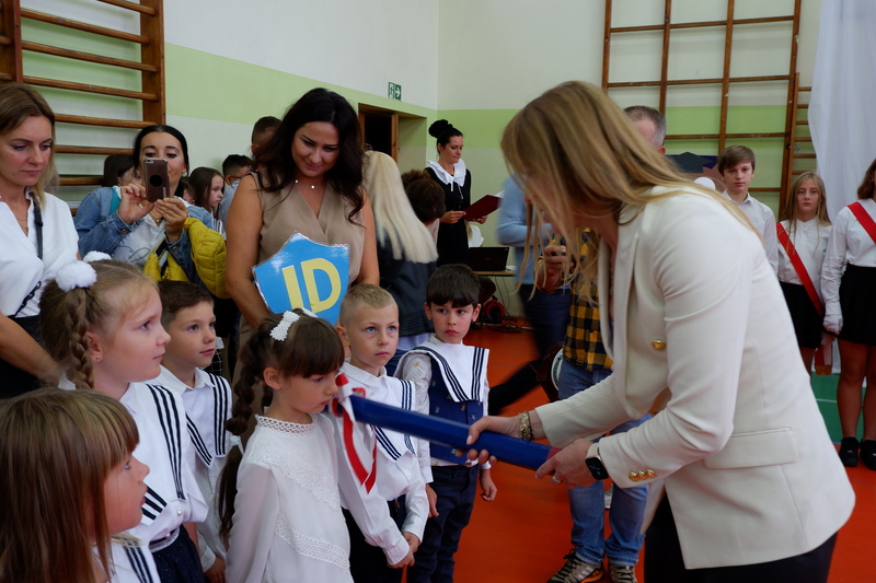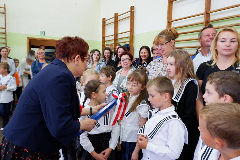 94 najmłodszych uczniów, którzy po raz pierwszy przekroczyli mury naszej szkoły, zaproszonych gości, pracowników, rodziców i krewnych przywitała Dyrektor Szkoły Pani Bożena Tatuśko.
