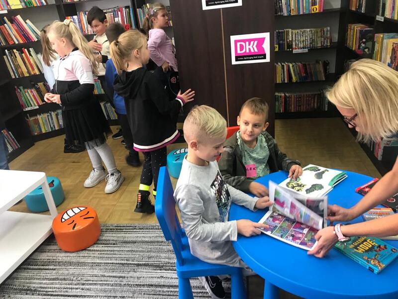 Uczniowie klasy I B mieli przyjemność złożyć wizytę w Miejskiej Bibliotece Publicznej w Darłowie. Od wejścia czuliśmy serdeczną atmosferę, którą stworzyły pracujące tam Panie. Lekcję biblioteczną poprowadziła p. Dyrektor - Joanna Witkowska, która w ciekawy sposób zapoznała dzieci z pracą biblioteki. Uczniowie dowiedzieli się, jak można korzystać z placówki, jakie zajęcia są tam dla nich organizowane. Rozmawiali również na temat swoich zainteresowań czytelniczych, po czym mogli zwiedzić wypożyczalnie zarówno dla dorosłych, jak i dla dzieci, gdzie zobaczyli, na których regałach można znaleźć interesujące ich książki.
