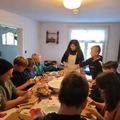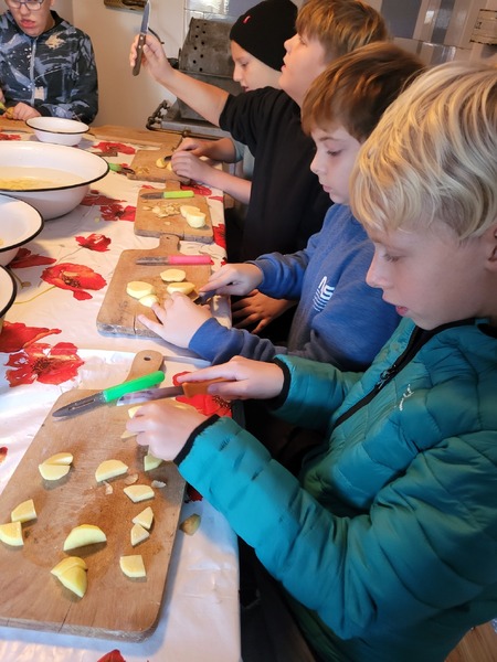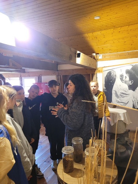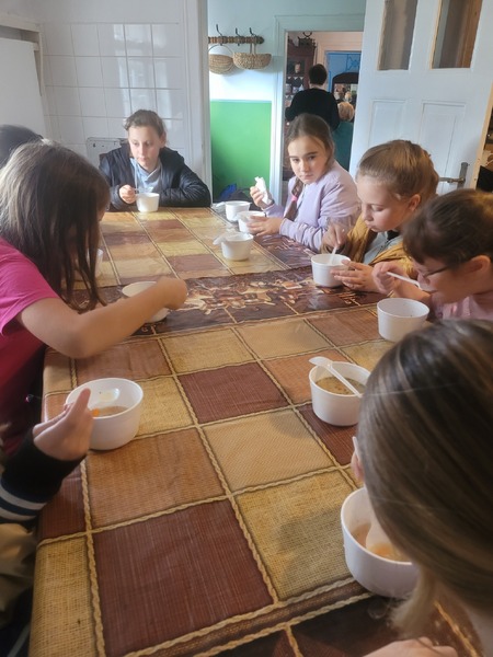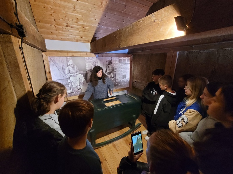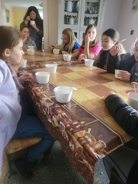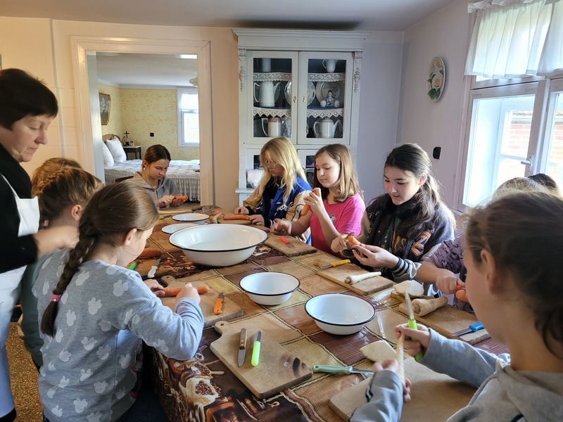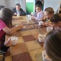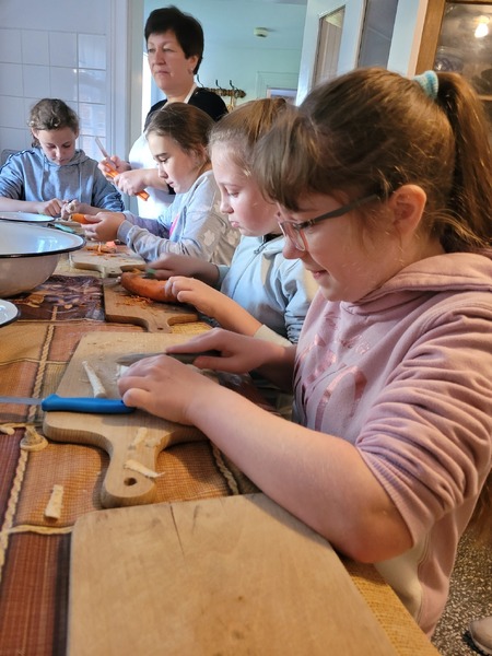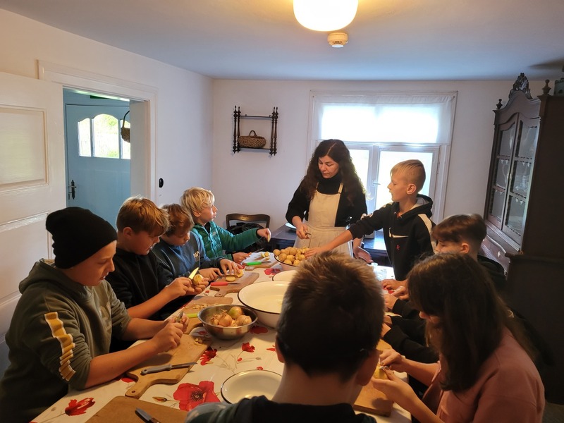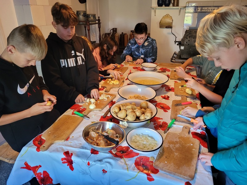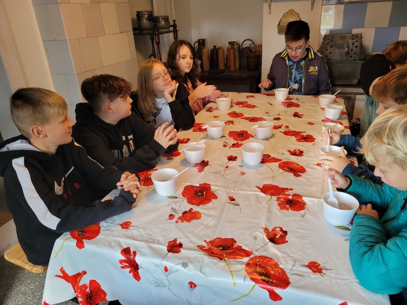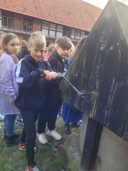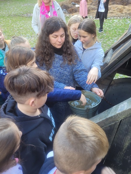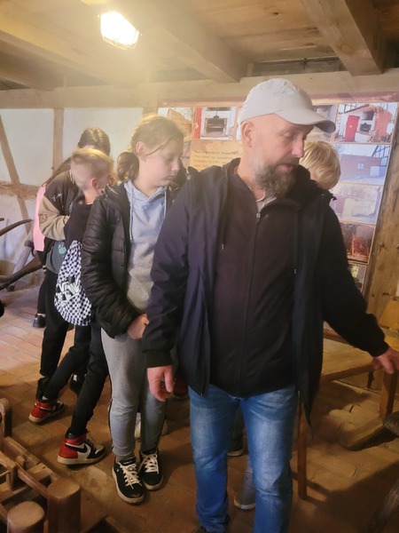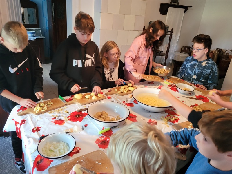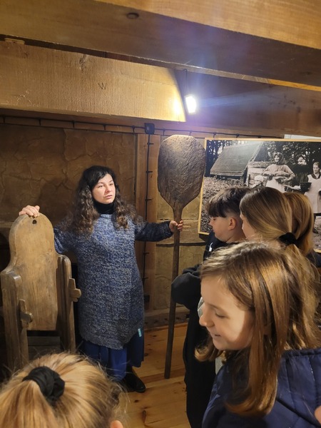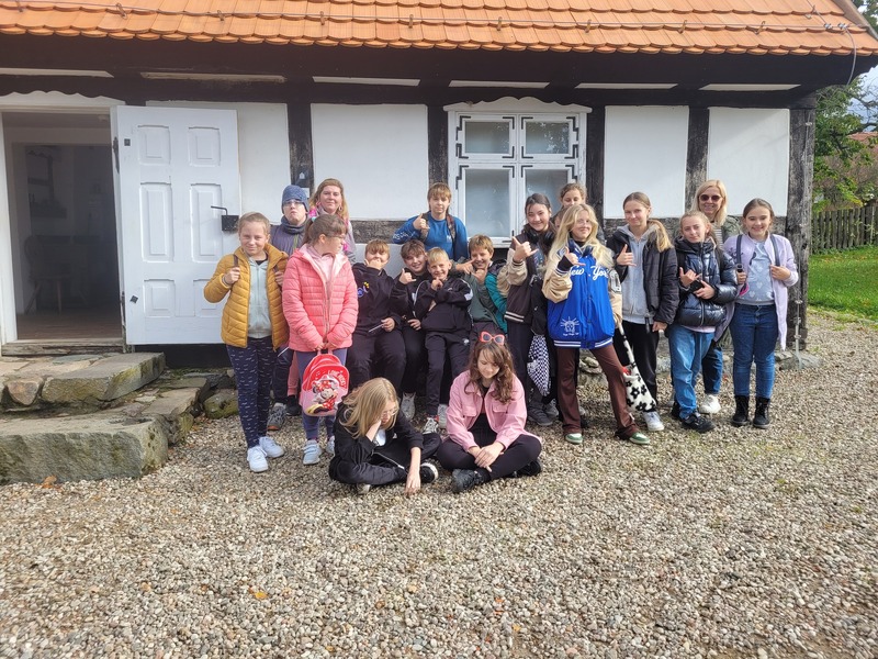 12 października br. uczniowie z klasy 5B wraz z opiekunami odwiedzili Muzeum Kultury Ludowej Pomorza w Swołowie. Jednym z punktów wycieczki był udział w warsztatach kulinarnych pt. „Pokaż mi, co w garnku masz - co dawniej jadano na pomorskiej wsi”. Podczas warsztatów uczniowie poznali starodawne wyposażenie kuchni i przygotowali warzywa do ugotowania kartoflanki, która została ze smakiem zjedzona. W dalszej części wycieczki uczniowie poznali historię życia mieszkańców wsi sprzed stu laty. Słuchając opowieści o tym, jak wyglądało dawne życie na pomorskiej wsi, oglądali stare narzędzia, archiwalne fotografie, zapomniane przez współczesność przedmioty. Swoimi wrażeniami z wycieczki podzieliła się Ola z 5B: „W zagrodzie Albrechta, którą obejrzeliśmy jest fajnie, ponieważ są tam stare przedmioty codziennego użytku. Zobaczyliśmy, jak kiedyś wyglądała kuchnia, salon, sypialnia i toaleta. W Swołowie spotkaliśmy zwierzęta zagrodowe: kaczki, gęsi, konie, psy i koty również. Tam nie można się nudzić (…) Polecam wybrać się na wycieczkę do Swołowa.”