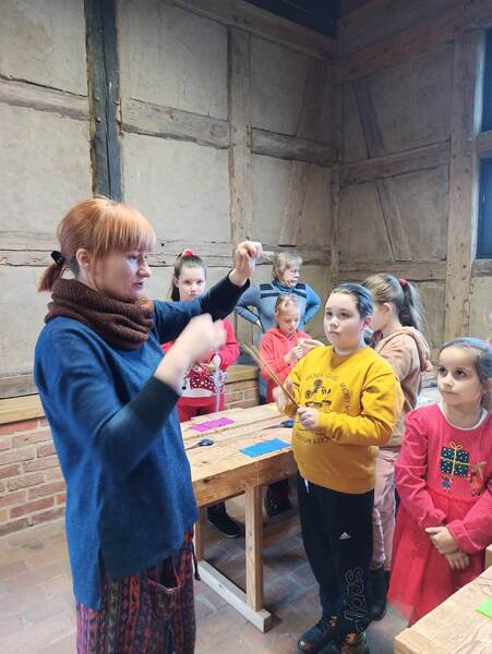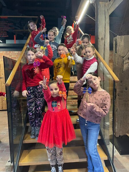 Kiedy aniołki były gotowe, przyszedł czas na zwiedzanie skansenu krainy w kratę. Dzieci z zainteresowaniem przeniosły się w czasy dawnego Pomorza.