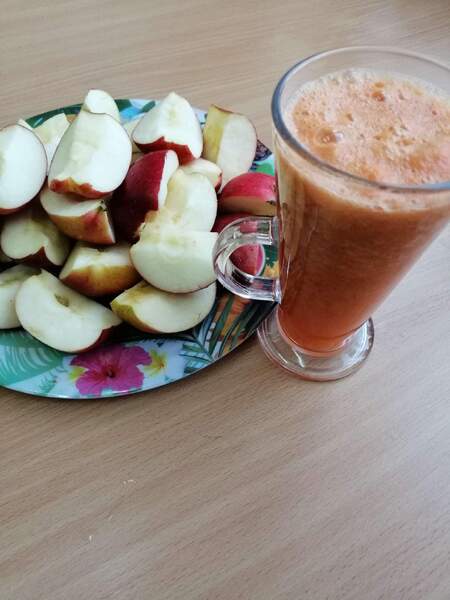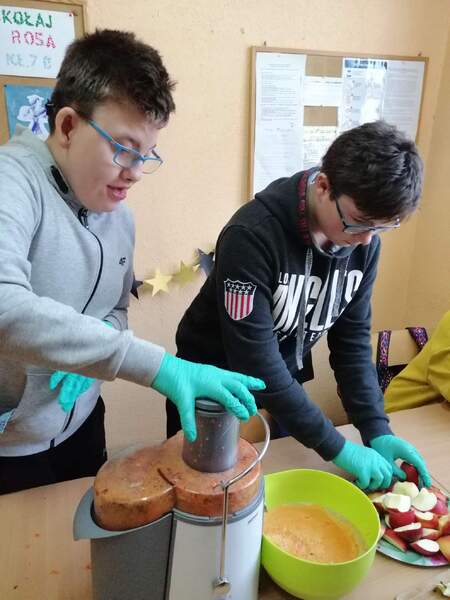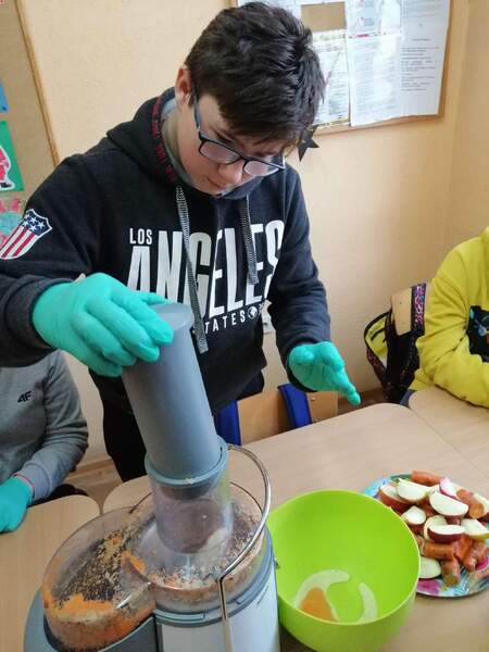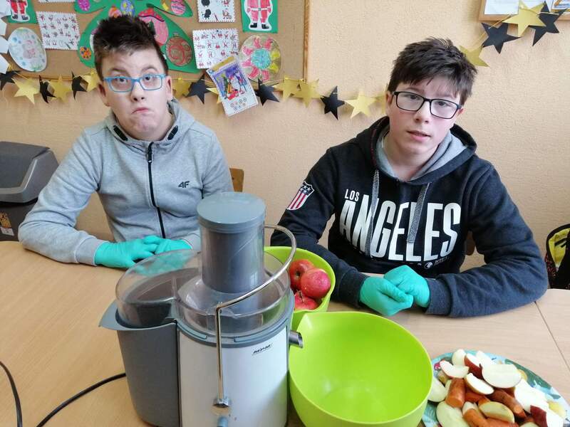 Kształtowanie postaw prozdrowotnych jest procesem długotrwałym. Nasi uczniowie wiedzą, że aby być zdrowym trzeba prawidłowo się odżywiać. Dlatego z wielkim zaangażowanie w czwartek 15 grudnia przystąpiły do robienie soku marchewkowo-jabłkowego. Jednak zanim przystąpiły do pracy, dzieci zapoznały się z urządzeniem do robienia soku - sokowirówką, jego działaniem i utrwalały sobie zasady bezpieczeństwa i higieny. Pozostało tylko wrzucenie składników do maszyny i sok gotowy. Wszystkim bardzo smakował, ponieważ wykonany był przez dzieci, bez dodatku cukru i konserwantów oraz z ekologicznych jabłek i marchewek.