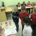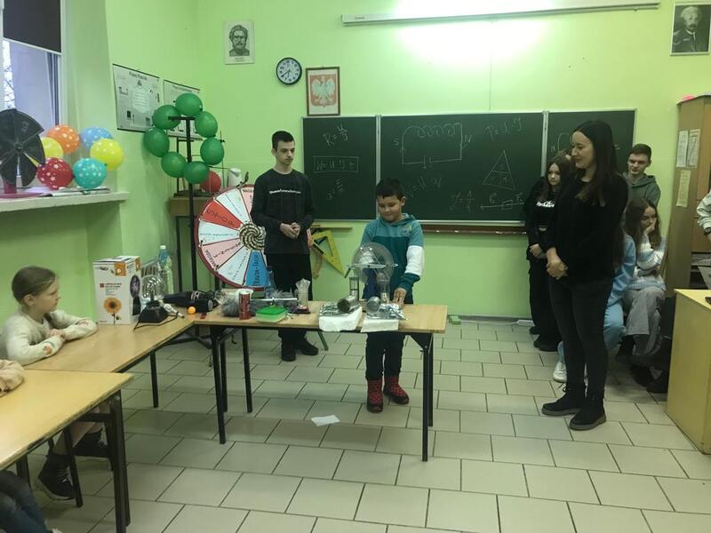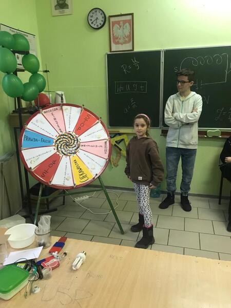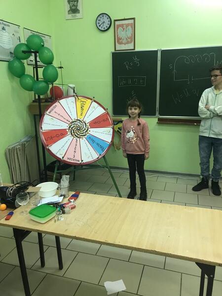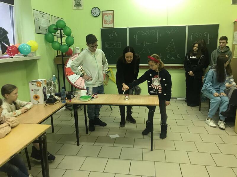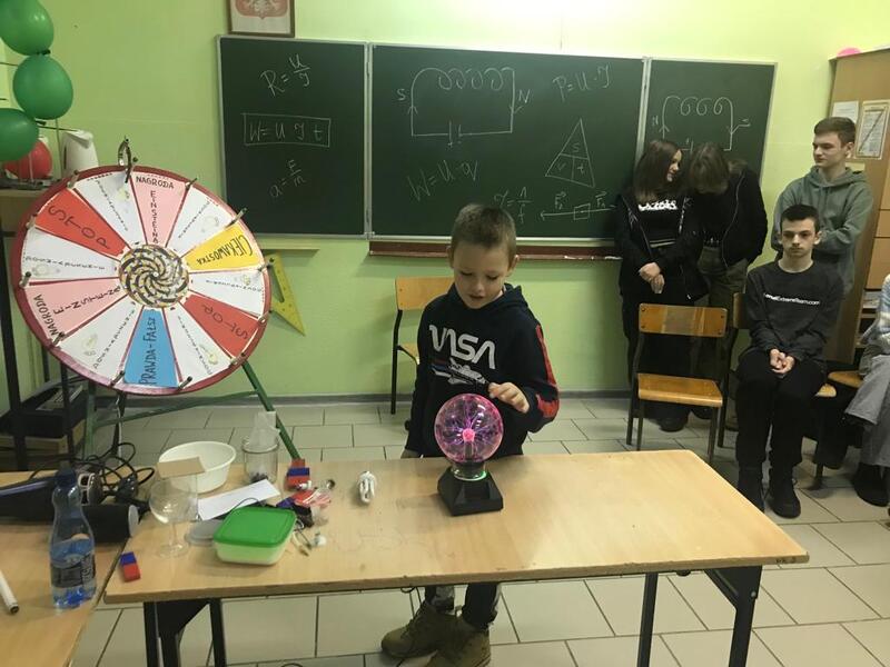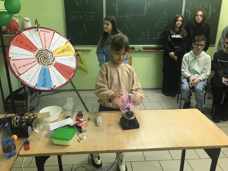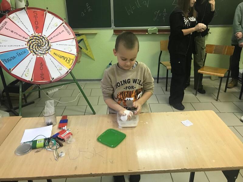 Uczniowie kl. I B wraz z wychowawczynią mieli okazję gościć u uczniów klas starszych. Pani Marta Sołtan, wraz ze swoimi podopiecznymi z kl. 7 i 8 uczęszczającymi na kółko fizyczne przygotowali lekcję fizycznych doświadczeń. Zajęcia były niezwykle ciekawe. Dla pierwszaków zostało przygotowane koło fortuny, dzięki któremu mogły wylosować różne ciekawostki przyrodniczo-fizyczne, doświadczenia oraz nagrody. Biorąc aktywny udział w działalności badawczej dzieci prowokowane były do wyciągania wniosków, szukania zależności, określania przyczyn i skutków. Zajęcia te dostarczyły im niezliczonej ilości nowych przeżyć związanych z odkrywaniem właściwości rzeczy i zjawisk.