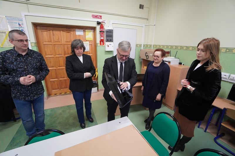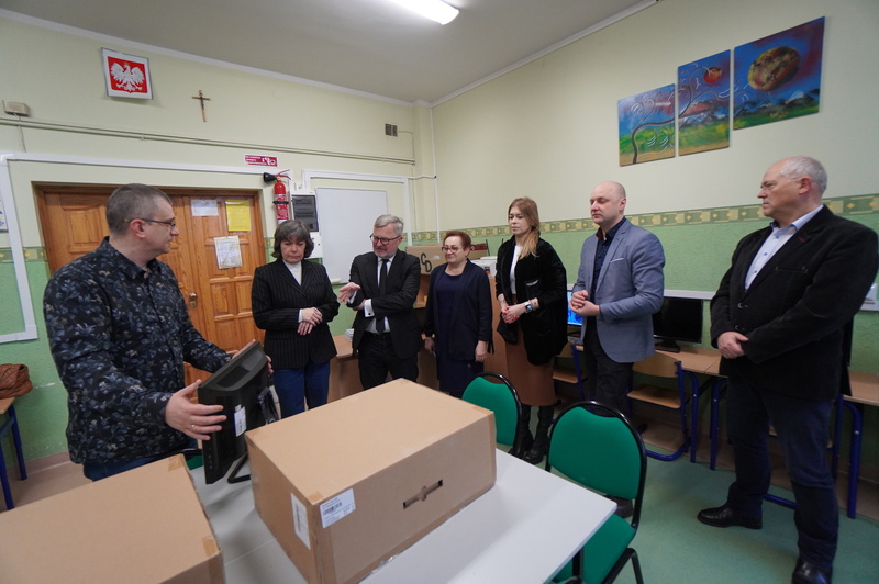 20.01.2023 roku na spotkaniu w Szkole Podstawowej nr 3 im. Króla Eryka Pomorskiego w obecności Burmistrza Pana Arkadiusza Klimowicza, Wiceburmistrza Pana Rafała Nagórskiego, kierowniczki Referatu Zamówień Publicznych Pani Joanny Sawickiej, kierownika Referatu Oświaty Spraw Społecznych Pana Zbigniewa Mielczarskiego, przewodniczącej Rady Rodziców Pani Joanny Klimowicz i Dyrektor Szkoły Pani Bożeny Tatuśko odbyło się uroczyste przekazanie sprzętu.