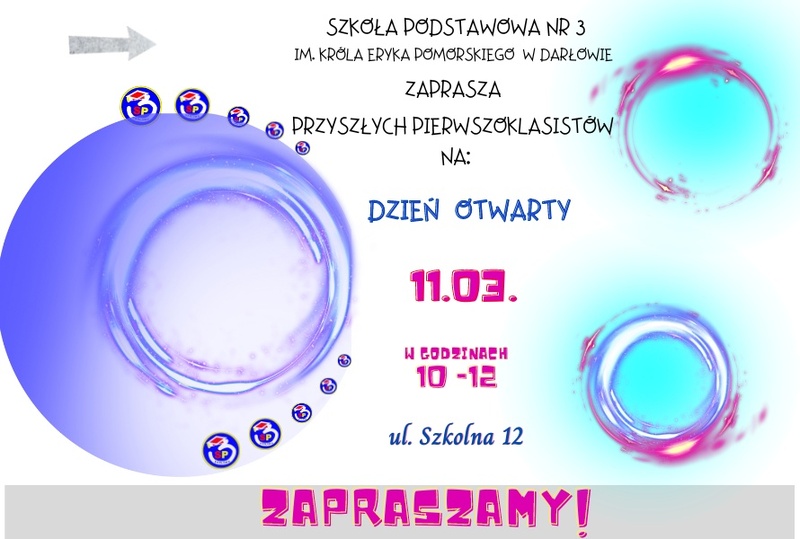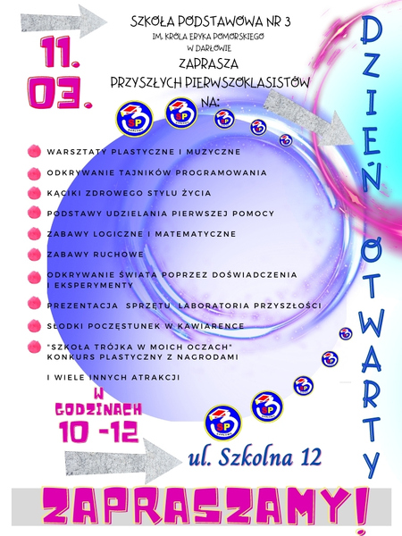 Szkoła Podstawowa nr 3 im. Króla Eryka Pomorskiego w Darłowie zaprasza przyszłych pierwszoklasistów wraz z rodzicami na dzień otwarty szkoły 11.03.2023 r. (sobota) w godzinach 10 -12 na ul. Szkolnej 12.