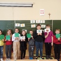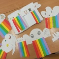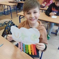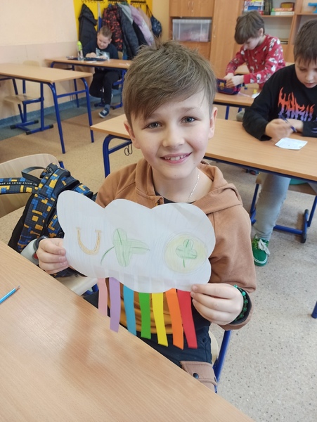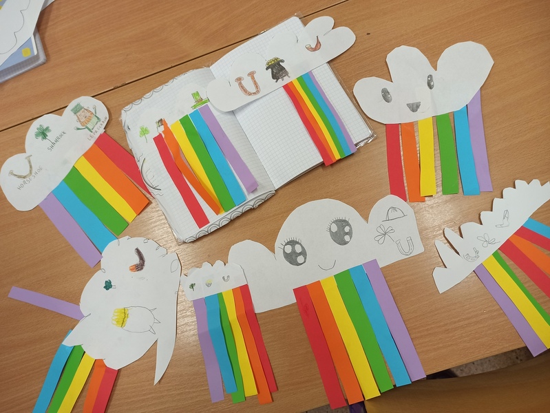 Uczniowie klas młodszych wykonali prace plastyczne - chmurkę z tęczą, w której umieszczali symbole kojarzone z Irlandią.