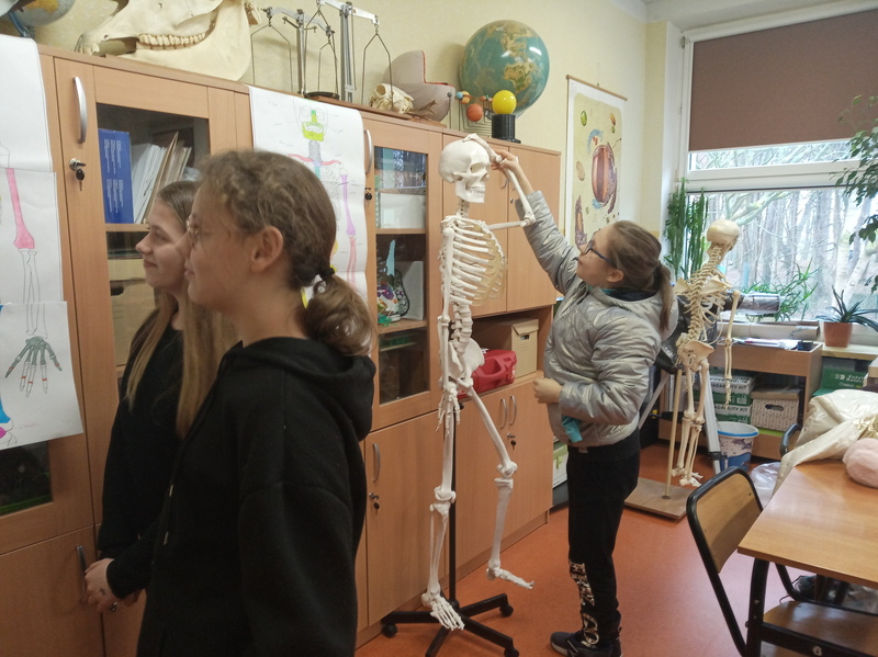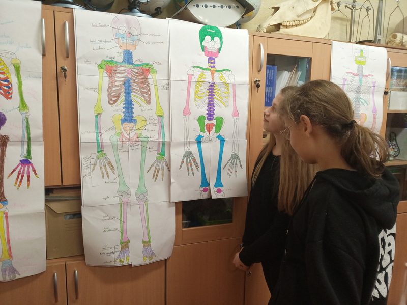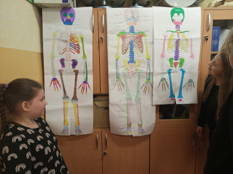 Uczniowie klasy 4A i 5E na zajęciach koła rozwijającego zainteresowania przyrodnicze uczestniczyli w cyklu zajęć o zbilansowanym odżywianiu się i poznawali właściwości poszczególnych składników pokarmowych. Szczególnym zainteresowaniem cieszyły się zajęcia z wykrywania obecności skrobi w produktach spożywczych czy badanie zawartości tłuszczu. Uczniowie w grupach także sprawdzali ilość dodanego cukru do ich ulubionych smakołyków. Wyniki niemile zaskoczyły wszystkich, ale dzięki temu mamy świadomość, że należy ograniczyć spożycie soków czy batoników. Ostatnim etapem było poznanie budowy szkieletu człowieka i wpływu soli mineralnych oraz innych składników odżywczych na stan naszych kości. Przed nami kolejne tygodnie pracy i poznawanie tajemnic przyrody!