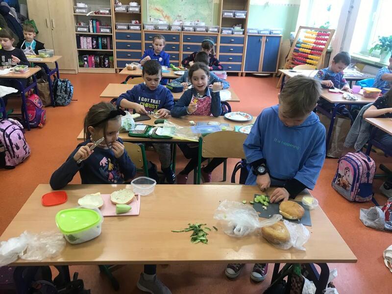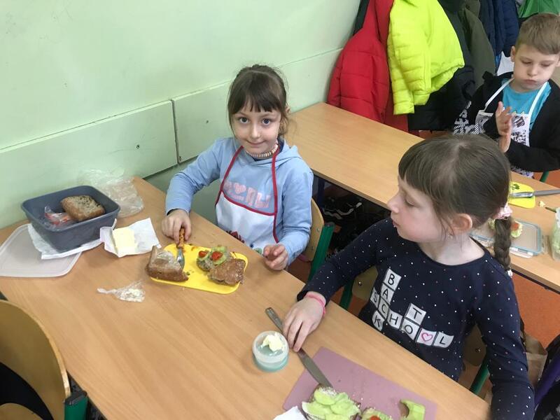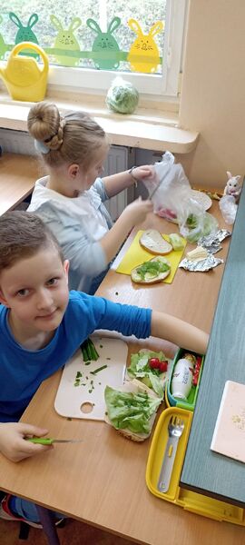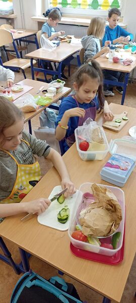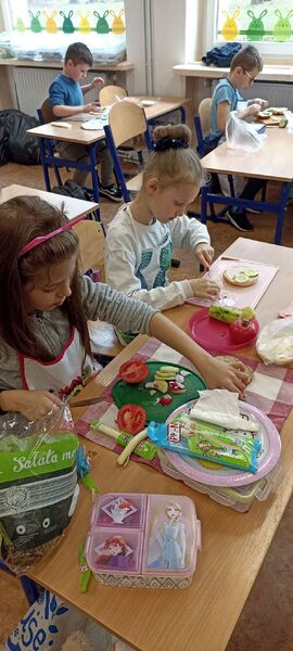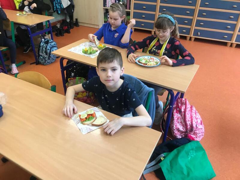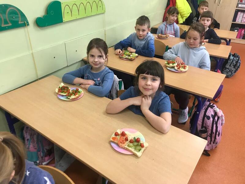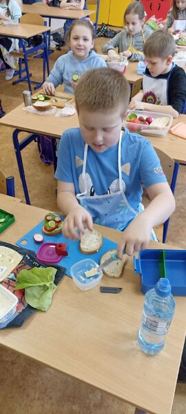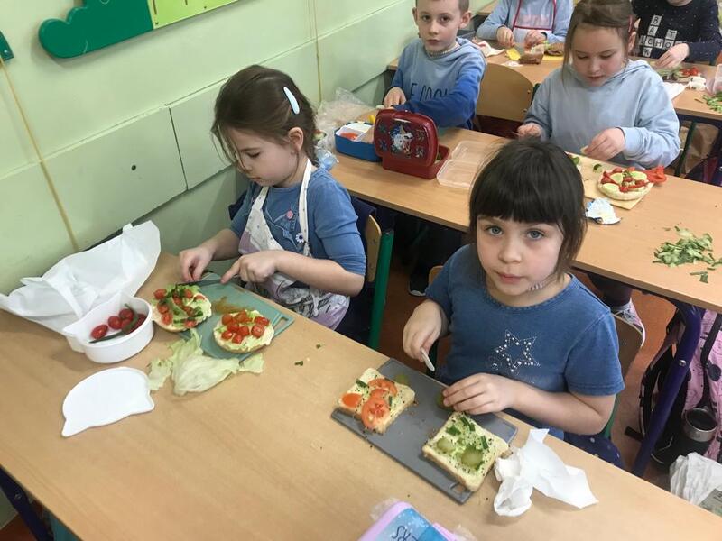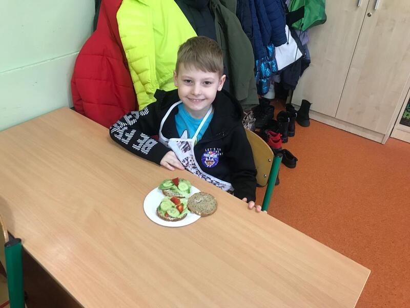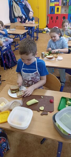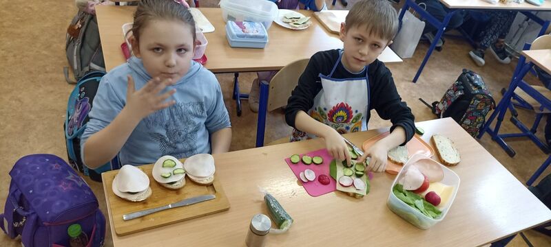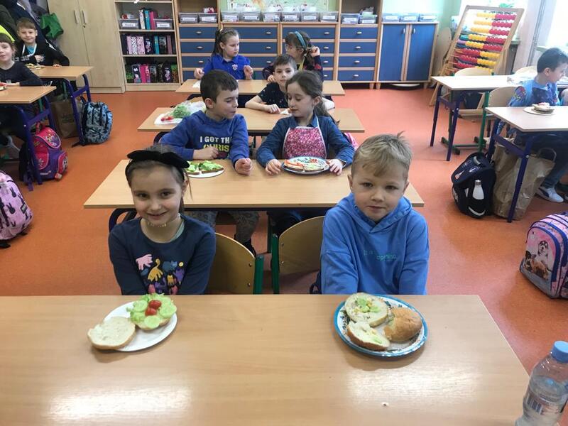 W ramach realizacji innowacji pedagogicznej „Moje zdrowie – moja siła, wielka moc”, uczniowie klas 1A i 1B na drugie śniadanie przygotowali kolorowe i zdrowe kanapki. Zajęcia kulinarne poprzedzone zostały rozmową na temat zasad zdrowego odżywiania oraz przestrzegania higieny podczas przygotowywania posiłków. Do wykonania swoich kanapek dzieci użyły ulubionych przez siebie warzyw oraz innych zdrowych produktów. Podczas pracy uczniowie wykazali się inwencją twórczą i przekonali się, że samodzielnie przygotowane kanapki smakują najlepiej.