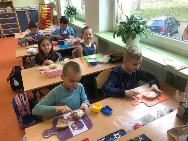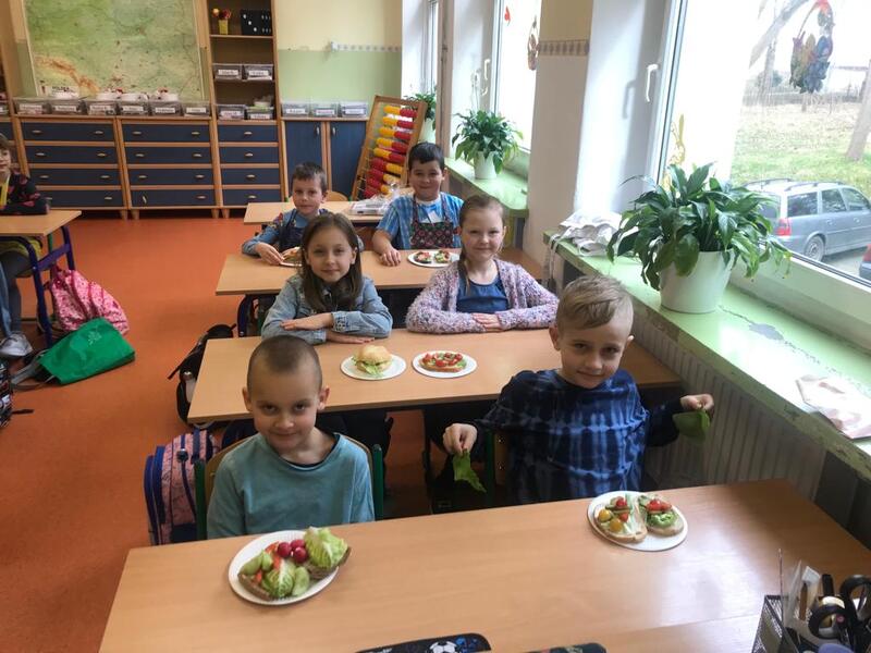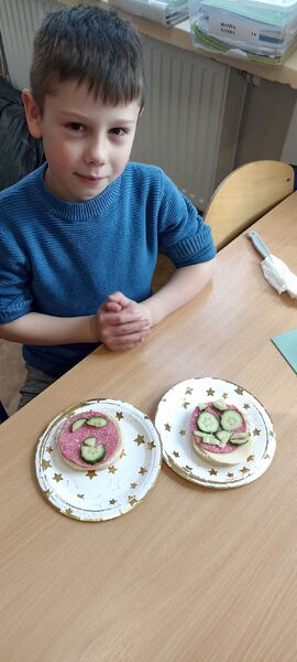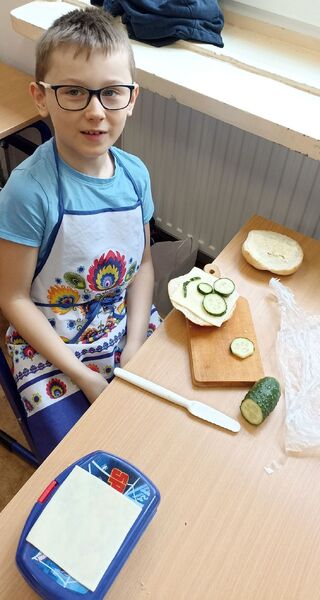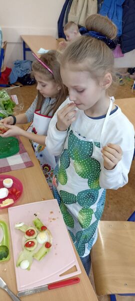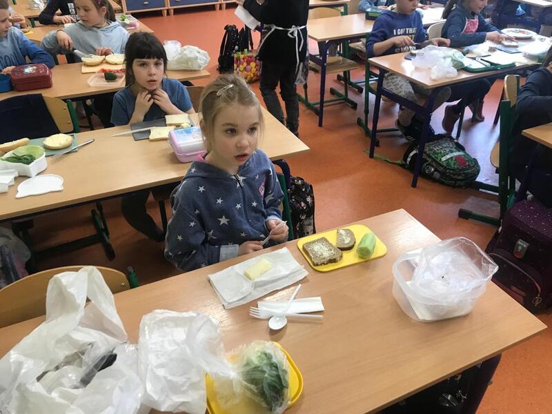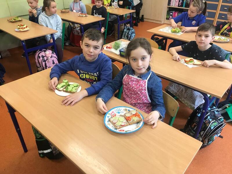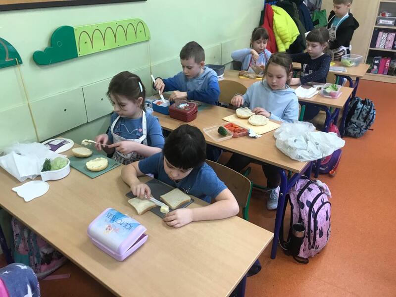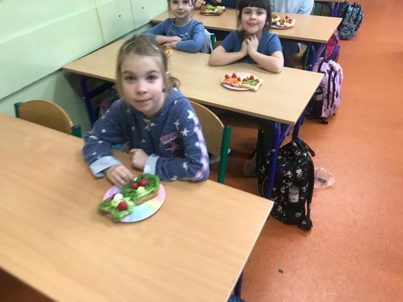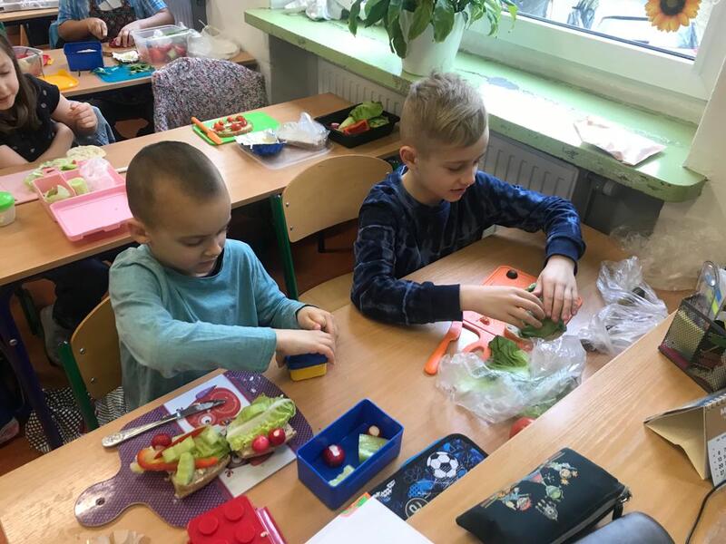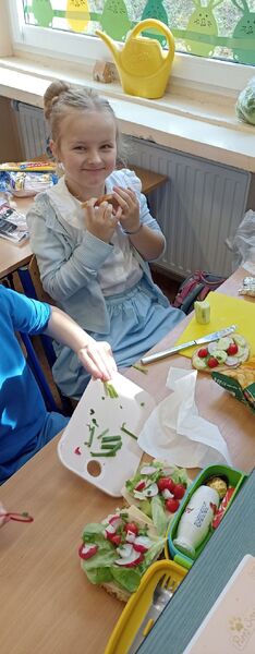 W ramach realizacji innowacji pedagogicznej „Moje zdrowie – moja siła, wielka moc”, uczniowie klas 1A i 1B na drugie śniadanie przygotowali kolorowe i zdrowe kanapki. Zajęcia kulinarne poprzedzone zostały rozmową na temat zasad zdrowego odżywiania oraz przestrzegania higieny podczas przygotowywania posiłków. Do wykonania swoich kanapek dzieci użyły ulubionych przez siebie warzyw oraz innych zdrowych produktów. Podczas pracy uczniowie wykazali się inwencją twórczą i przekonali się, że samodzielnie przygotowane kanapki smakują najlepiej.