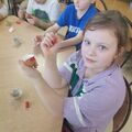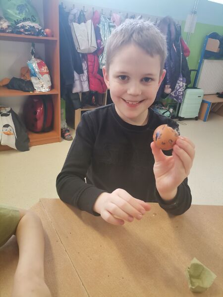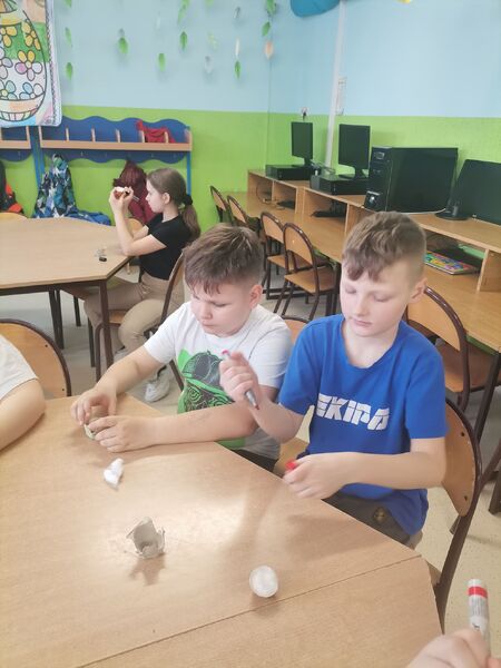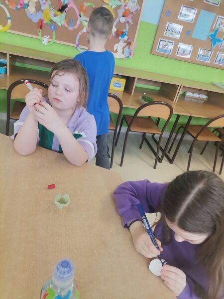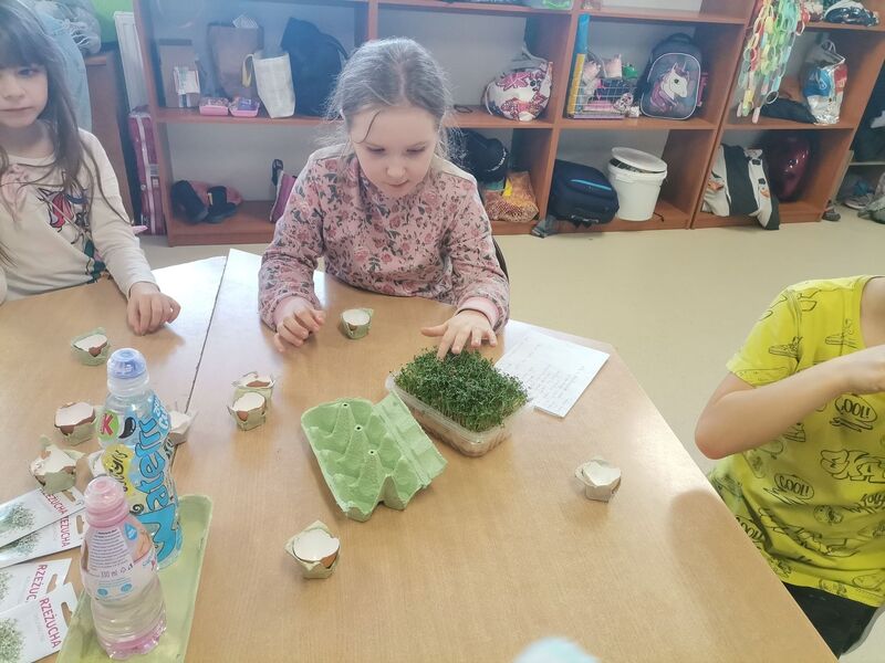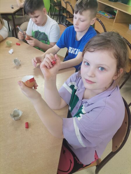 Na świetlicy także zagościła wiosna i przyszedł czas na przygotowania do świąt. Podczas zajęć dzieci dowiedziały się o symbolice pokarmów z koszyka świątecznego, a także miały okazję zasiać rzeżuchę w skorupkach po jajkach.