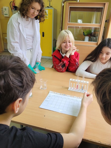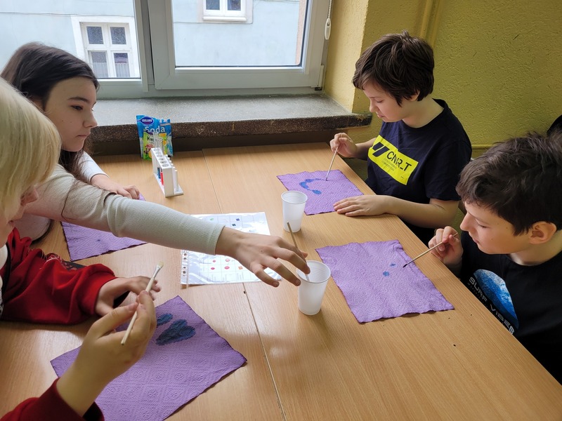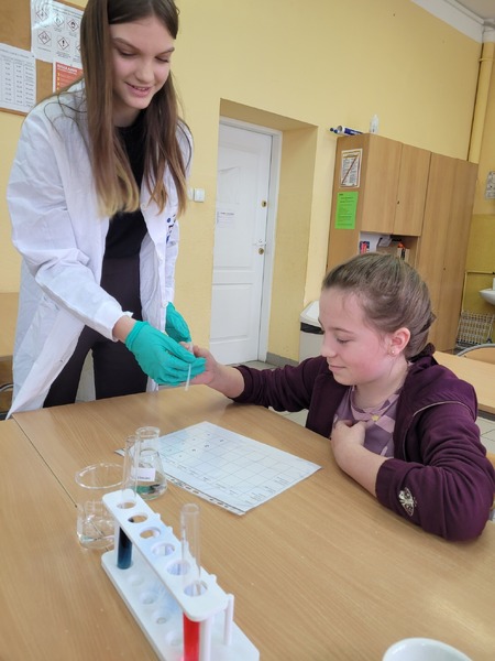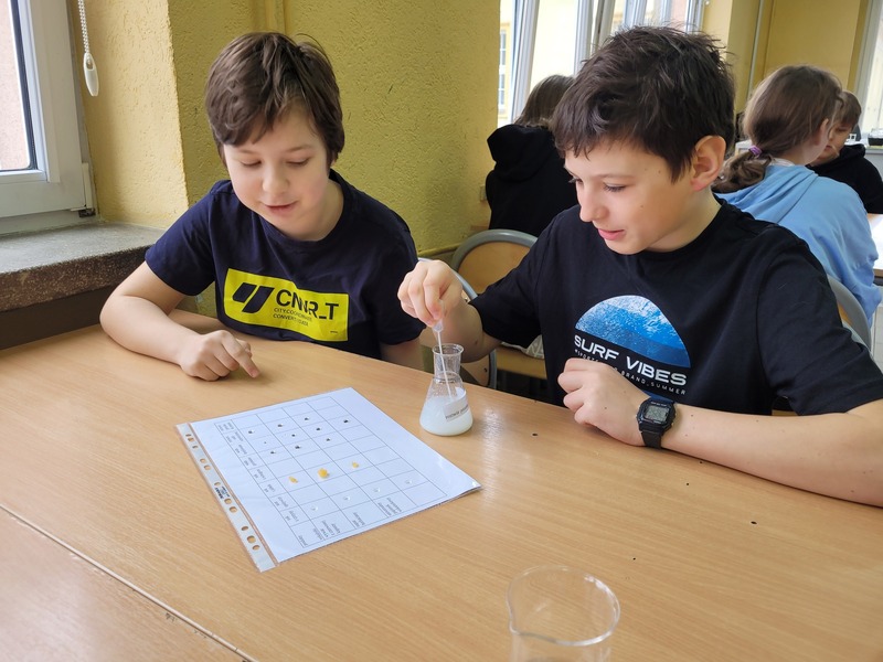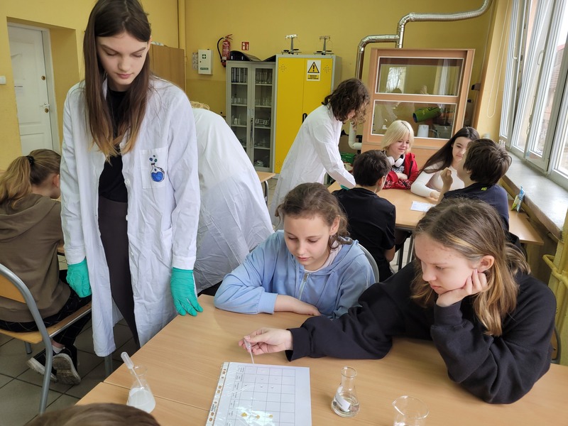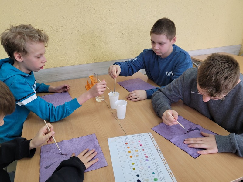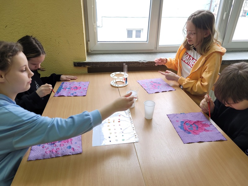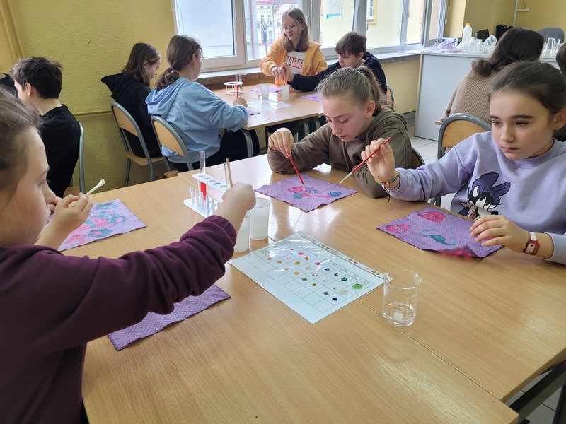 Uczestnicy lekcji sprawdzali barwę, stan skupienia, rozpuszczalność w wodzie oraz ich odczyn. Mieszając substancje otrzymywali barwne związki, których kolory magicznie się zmieniały.