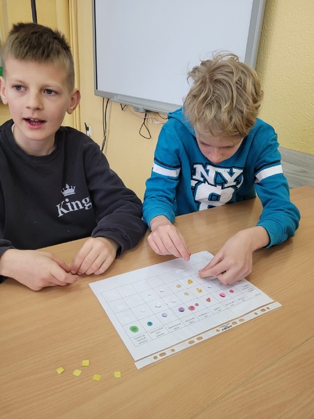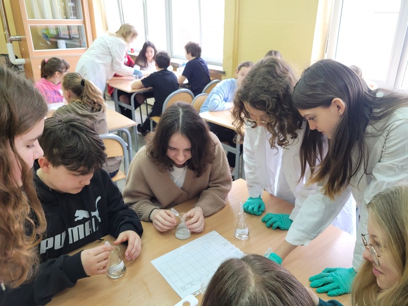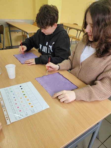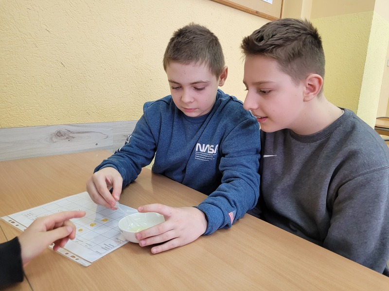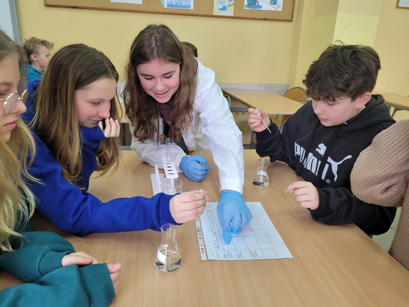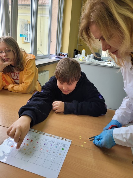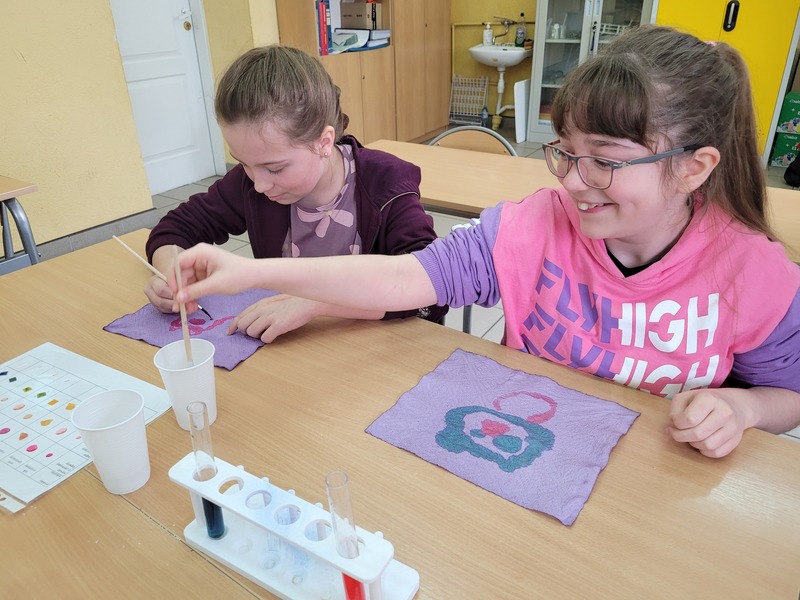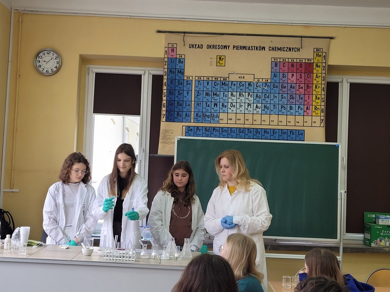 Uczestnicy lekcji sprawdzali barwę, stan skupienia, rozpuszczalność w wodzie oraz ich odczyn. Mieszając substancje otrzymywali barwne związki, których kolory magicznie się zmieniały.