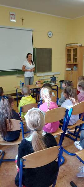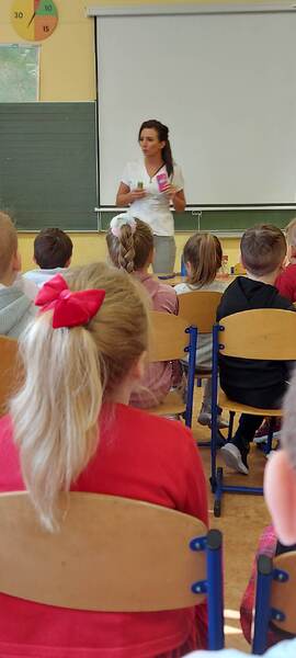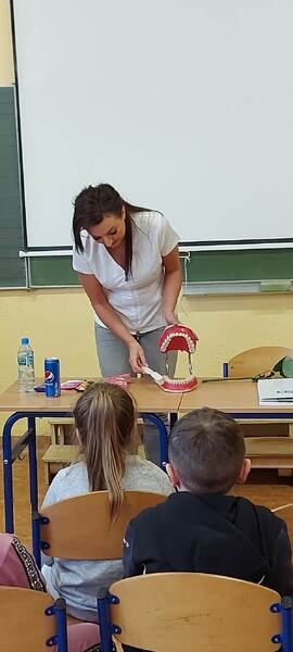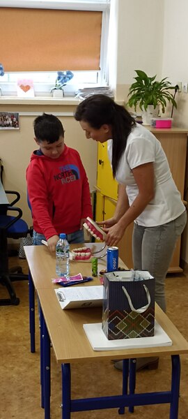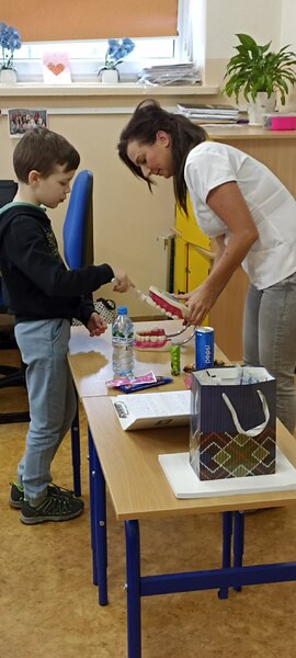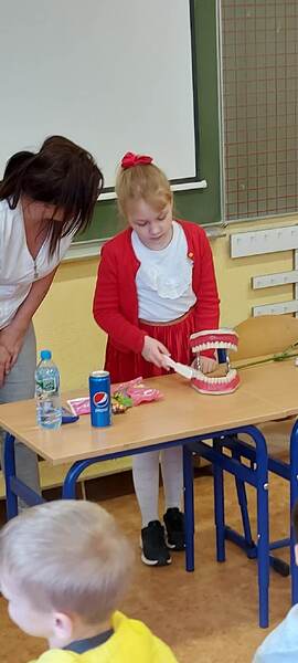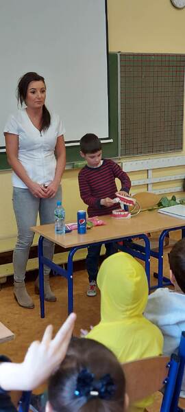 Każdy z nas zapewne wie, jak ważnym elementem jakości życia każdego człowieka jest higiena jamy ustnej. W ramach szkolnej akcji „Kwiecień miesiącem zdrowia”, uczniów klas pierwszych odwiedziła pani higienistka stomatologiczna. Pani Kasia mówiła o konieczności codziennego szczotkowania zębów, a także pokazała dzieciom prawidłową technikę ich mycia. Zwróciła również uwagę na odpowiednie odżywianie, które ma ogromny wpływ na kondycję naszych zębów. Musimy pamiętać, że zdrowe i zadbane zęby dają nam zadowolenie z własnego wyglądu, a prawidłowa profilaktyka i higiena jamy ustnej ma służyć temu, aby zęby były zdrowe. Bardzo dziękujemy pani Kasi za przekazanie dzieciom cennych wskazówek co do właściwej pielęgnacji jamy ustnej oraz za podarowanie pierwszakom szczoteczek do zębów i kolorowanek.